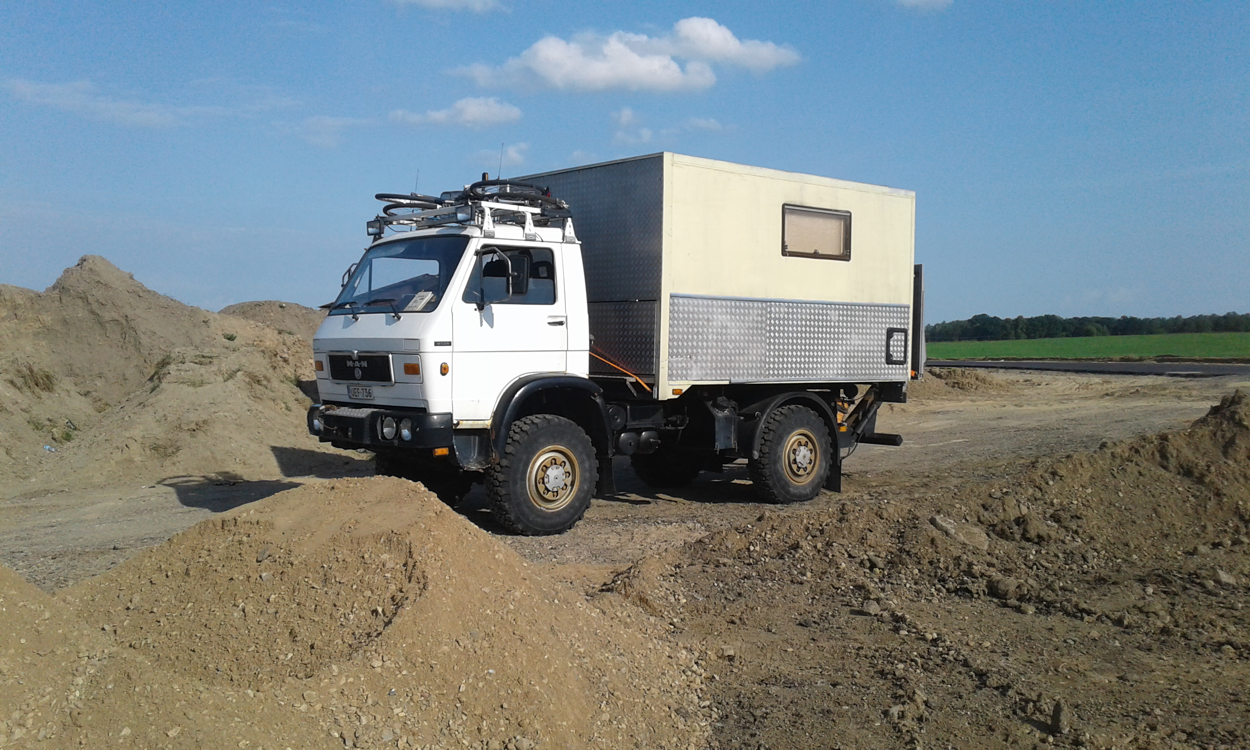 Meillä on kaappimatkailumaastokuorma-auto, tai mikä lie. Alustana on Yhdeksän tonninen MAN FAE, eli neliveto, vuodelta 1986. Asuinkoppina on alkujaan Ruotsissa sähköyhtiön huoltoauton korjaamotilana toiminut noin nelimetrinen eristetty koppi.