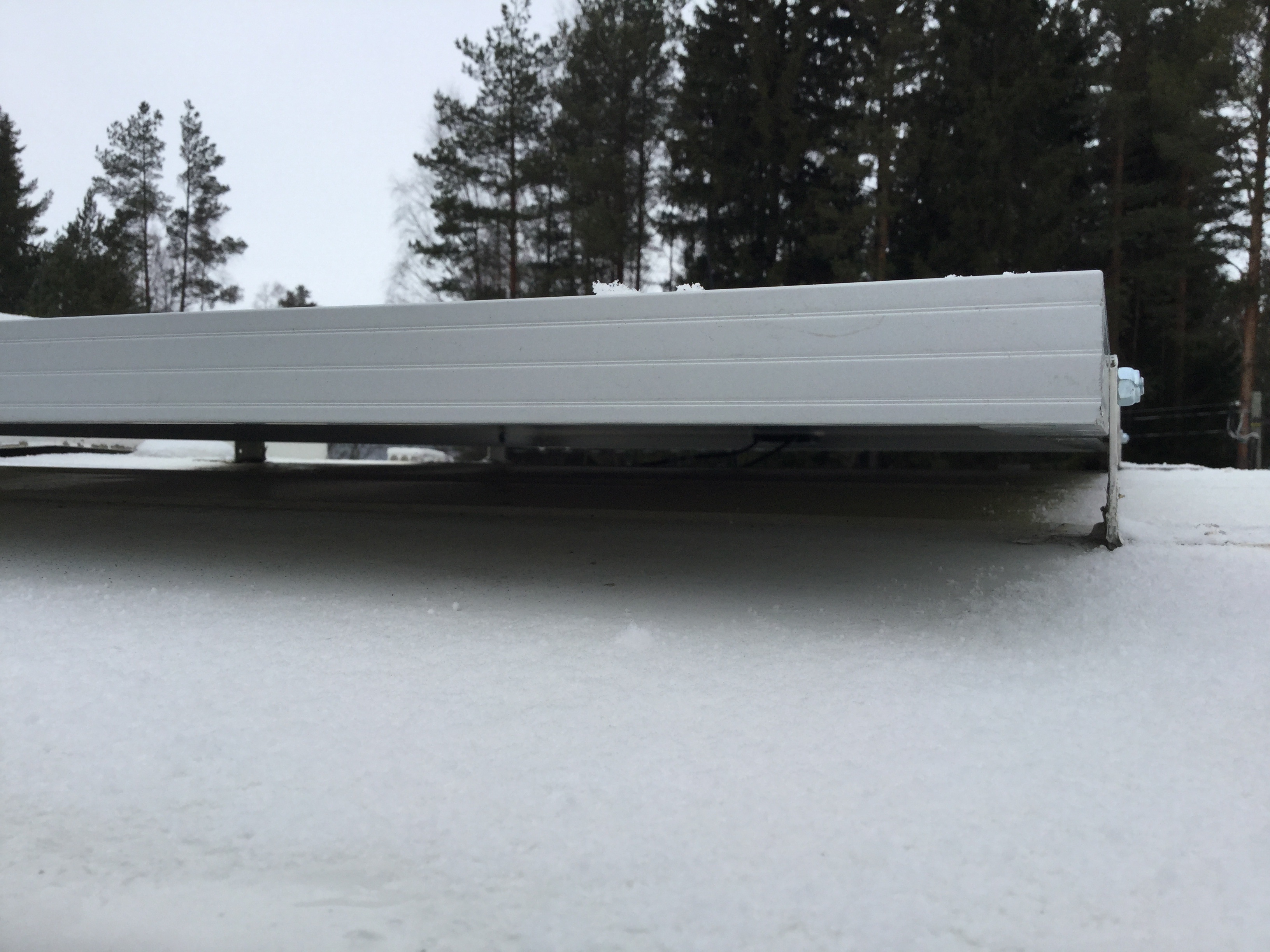 En laittanu kiskolla, vaan neljällä n.80x80mm n.300mm pitkällä peltikulmalla. Liimalla ja popparilla kiinni paneelin kehykseen, ja liimalla kattoon, liimana joku ms-liimamassa, pur-massakin menee jos ulkokäyttöön tehty. Tänä keväänä yllätyksekseni huomasin että paneelin takapnnn pellit oli irronnu liimausesta, niin että liimat oli katossa ja kulma irti. Syy tähän lienee pelti joka on "sinkitty" (kattopellin takapuolen tapainen pintakäsittely). Laitoin lisää liimaa ja varmistukseski popparin läpi katon. Päälle liimamassaa, vuotoja odotellessa...