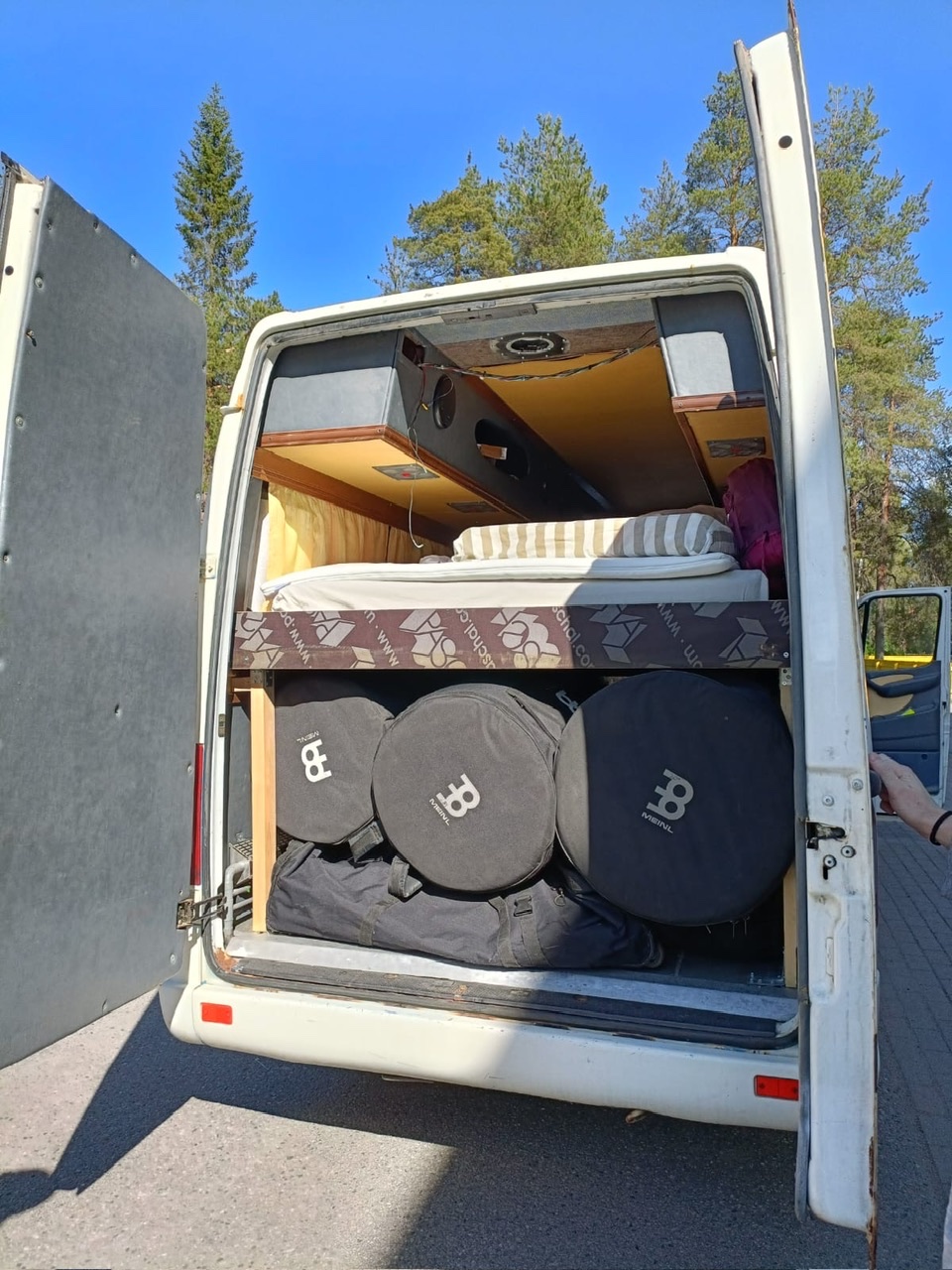 Just kävin Etelä-Puolassa festarikeikalla, auto ihan täys kamaa ja kaks oikeeta muusikkoa mun lisäks (mä oon rummut ja lyömäsoittimet - muusikon paras kaveri) ja ihan hyvin meni kolme viikkoo. Lähtiessä hommasin Baukkarista pari ladattavaa tuuletinta ja niillä ja ovien / ikkunoiden taktisella raottamisella sai pidettyä nukkumalämpötilat mukavasti vähä saunatason alapuolella. Etuikkunoissa asuntoautofoliot ja takaikkunoissa retkipatjasta iha itte askarrellut aurinkodempparit.