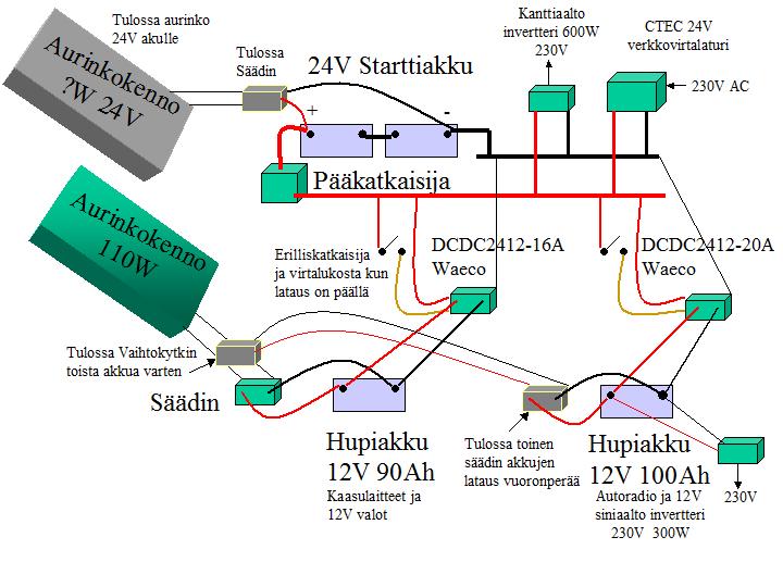 Jos näin yhdellä säätimellä vois järjestää hupiakun ajoaikaisen latauksen, niin olis aika simppeli systeemi, jos vrt. 24 V--invertteri 230V--laturi 12V.