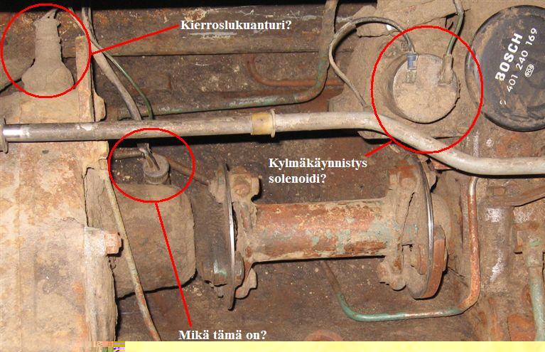 download/file.php?id=466&mode=view löytyy kuva koneen päältä. Mittarin takaa anturin piuhat yhteen ja anturin liittimestä mittaat resistanssin, niin saat selville piuhojen kunnon. Sitten vielä tietenkin mittaat että mittarille tulee jännite. Anturin mittaaminen antaa joitain (satoja)ohmeja, riippuen anturin tyypistä. Itselläkin tämä edessä, mutta kun on muka niin paljon muutakin tekemistä