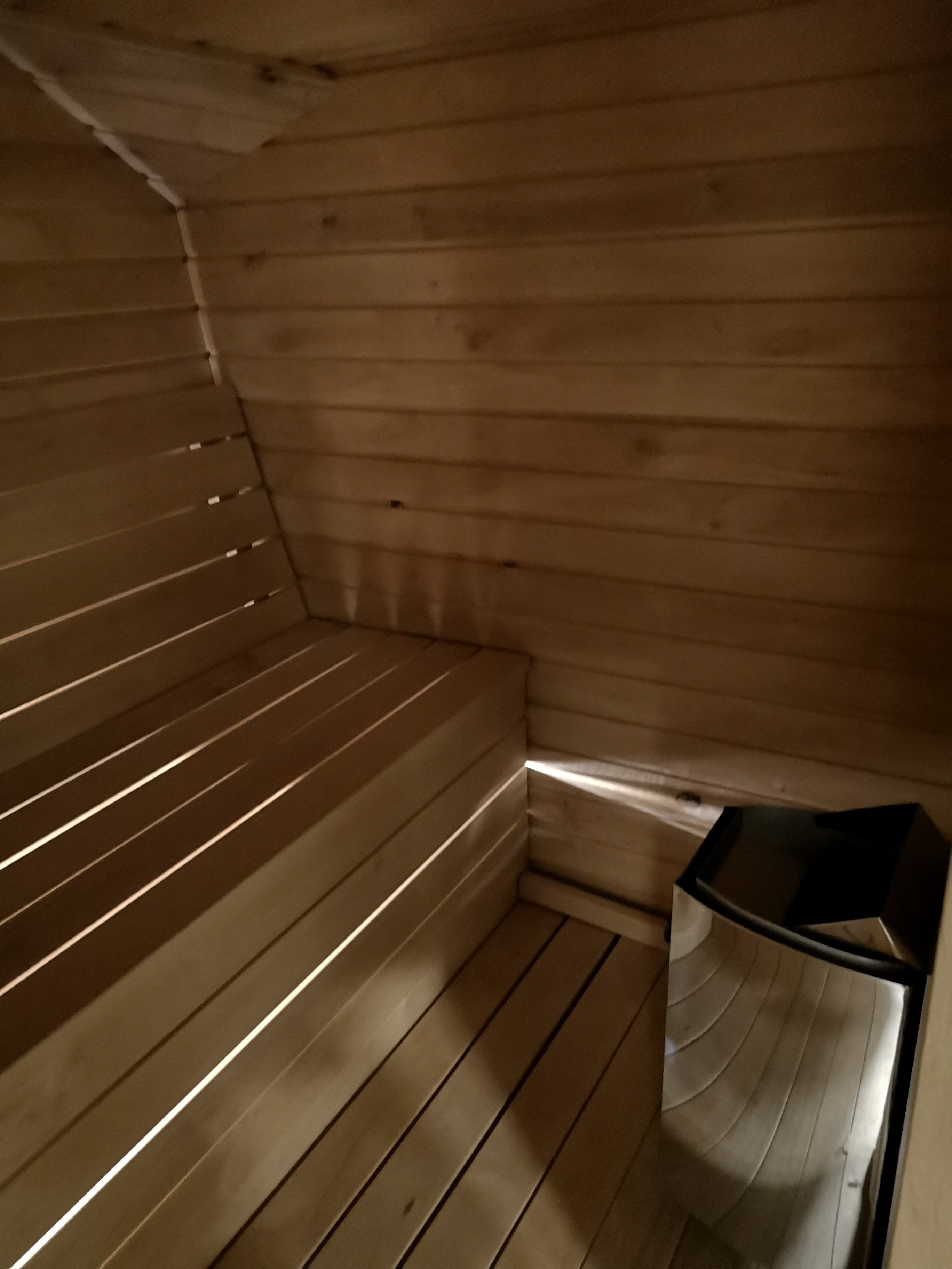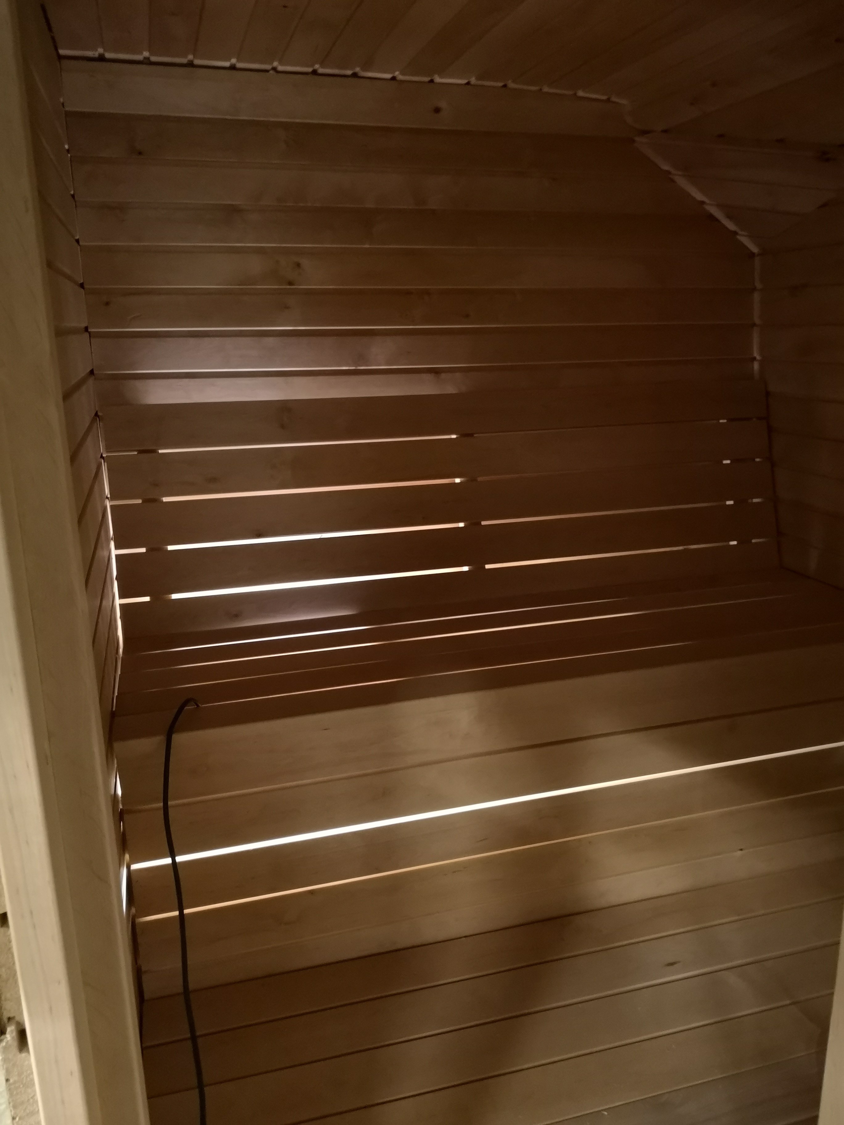 Sauna myös suurimmalta osin takakorokkeen päällä, joten matala tila, mitoiltaan muistaakseni 1m x 1,4m.