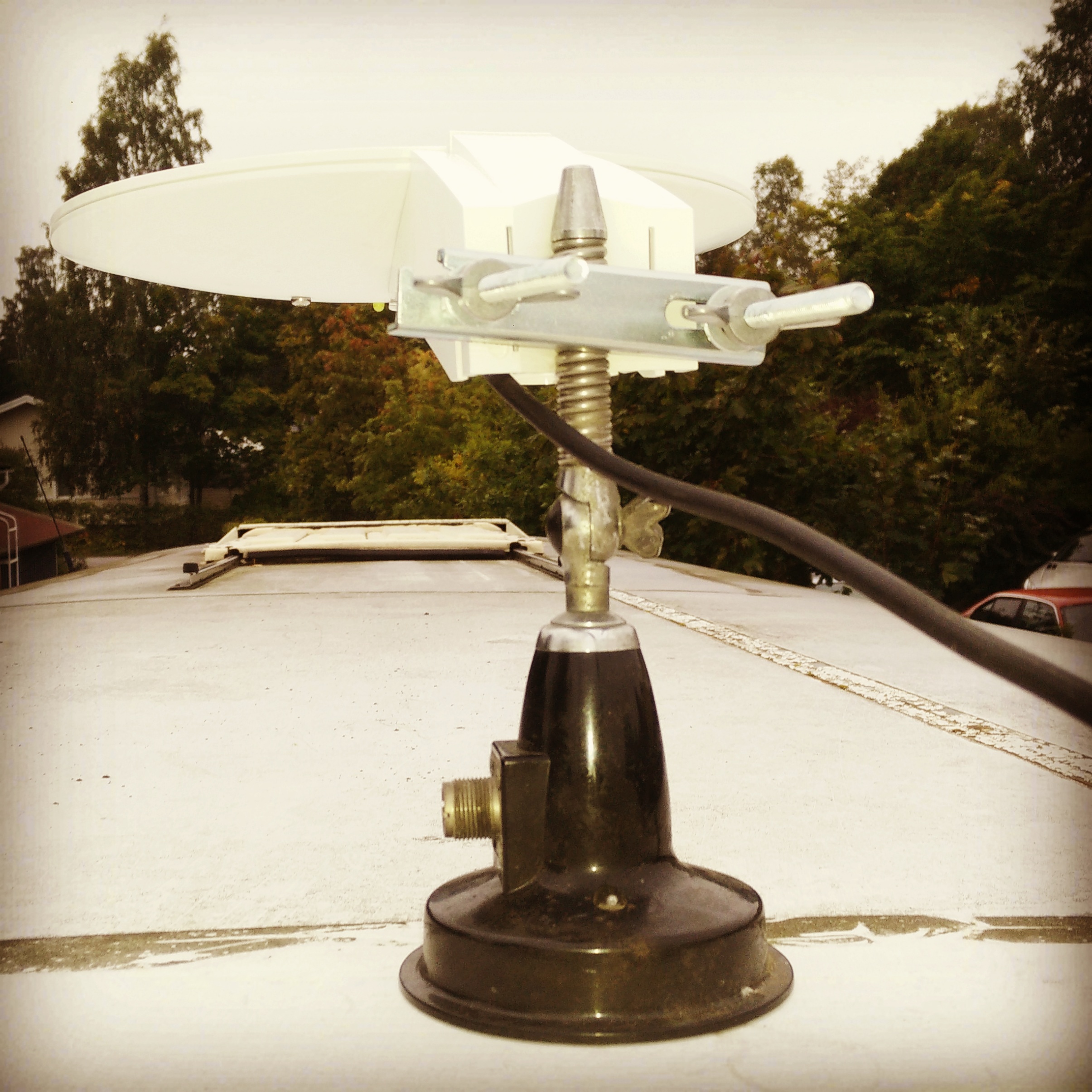 Parkissa ollessa hyvä antenni on triax ufo (ympäri säteilevä, ei tarvi suuntailla) tosin vois olla masto ja nostaa 30 cm ylös tai esim perästä vähän yli tai jos lasikuitukatto niin käy kiinteä asennus.