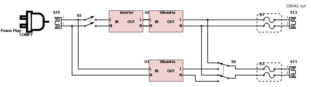 Toisessa nyt haettu vähän tätä ideaa että saisi halutessaan osan sähköistä kytkettyä invertterin ohi. S5 ja S6 kuuluisi oikeastaan olla samaa linkitettyä kytkintä. Eli ideana on että jos tarvii esimerkiksi sähkökiukaalle imeä kaikki maasähkö, voi S5+S6-kytkimillä irroittaa invertterin maasähköstä ja ajaa ST3-liittimelle akkusähköä ja ST1-liittimelle suoraa maasähköä.