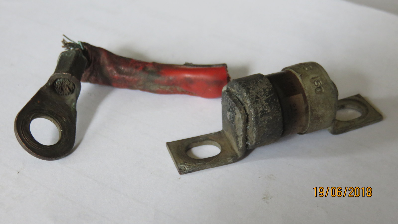 150A ylikuormitussuoja/lämpösulake oli palanut rikki kun huonoliitoksinen liitin kuumensi sitä kuvassa.