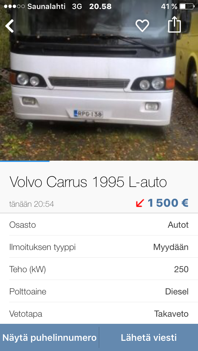 Irizar man tarjous 17+ alv hylätty, nyt myynnissä hinta yli 30 t€ sis alv, nettikoneessa myynnissä, taitaa mennä henkilöliikenteeseen,
