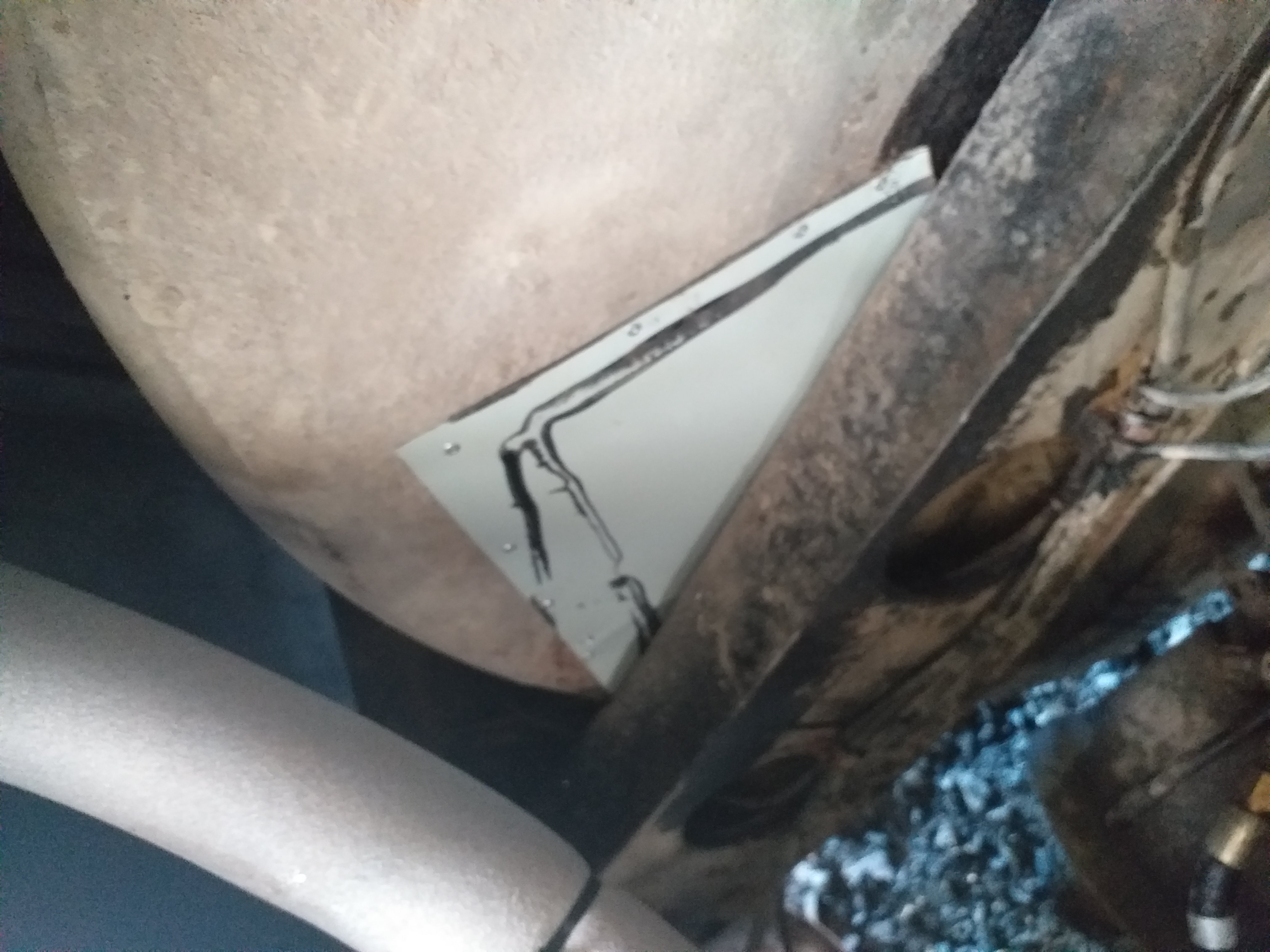 Minä onnistuin ruohonleikkurilla linkoamaan pikkukiven takasivulasiin ja nyt siinä on tilalla alumiinipelti. Onneksi tuo oli sisältä peitetty ikkuna.