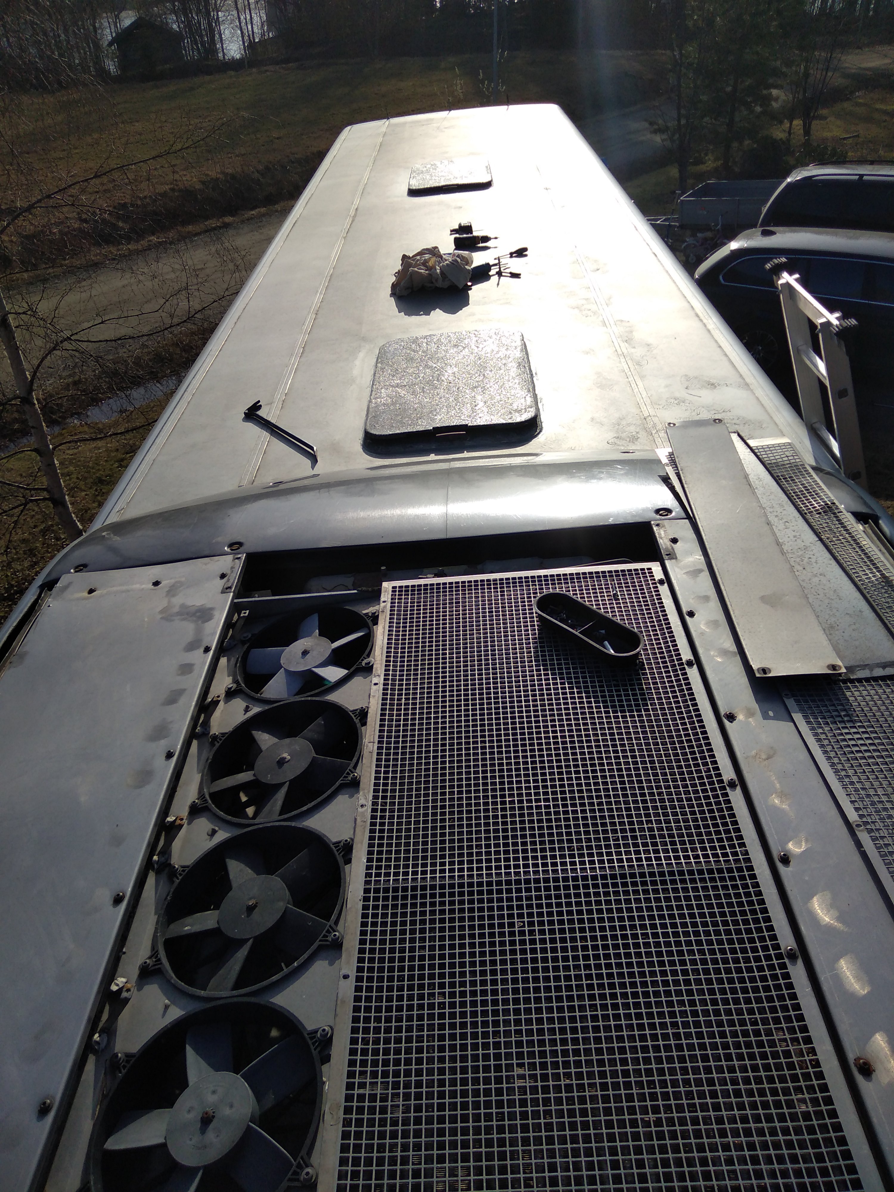 Juu, keulasta aloitin. Tuulilasin yläkulma, kulmavalot, kolme antennia, kaksi kattoluukkua ja ilmastoinnin kennokotelot. Huh mikä homma.