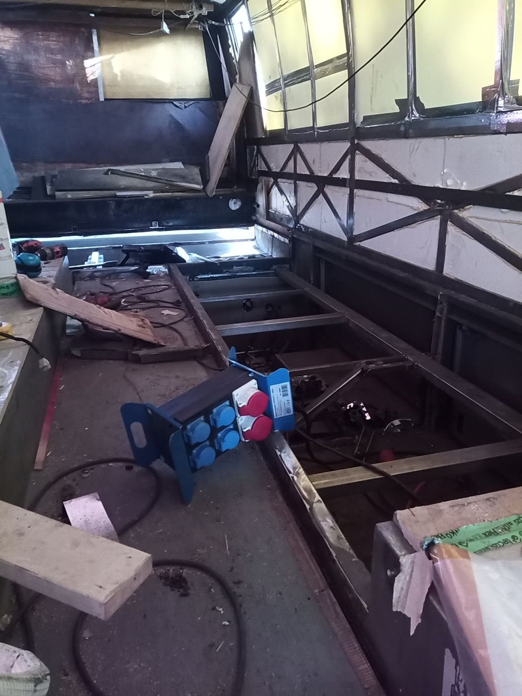 Tuolla takaosan pellin alareunassa, n. 20 cm uuden lattiatason yläpuolella näkyy paikat, mihin meni auton pituussuunnassa 30*30 mm ohutseinäputket. Nämä oli hitsattu vain alareunasta kiinni tuohon peltiin, bonuksena noiden kantattujen peltien väliset hitsit oli ratkennut irti tuon rungon kohdalta. Loppuosan rungosta muodostivat erilaiset nitomalla toisiinsa kiinnitetyt vanerisoirot, oli kai joissain väleissä liimakin, ainakin uutena ollut... Uudesta rungosta taisi tulla liian hyvä, notkuu jalan alla vähemmän kuin alkuperäinen, vaikka tästä puuttuu vaneritkin viel.