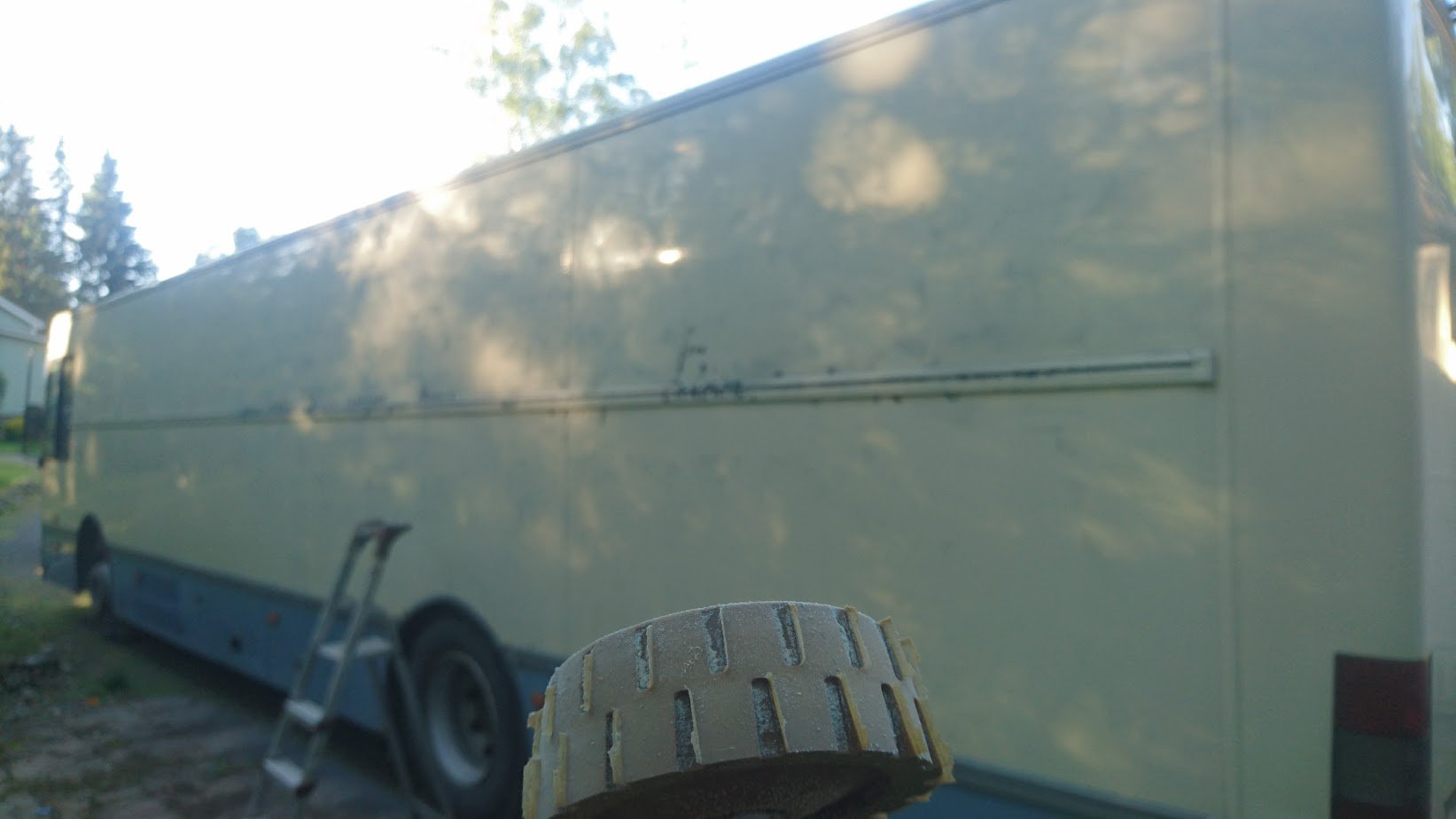 Nelisen vuotta sitten aloin kirjastoautoa metsastämään ja melko nopeasti löysinkin sopivan aihion josta jätin tarjouksen. Muutaman viikon päästä olinkin sitten hakemassa projektia kotiin Hämeenlinnasta. Kotipihaan autolla ei heti ollut asiaa kun pihat olivat jäisiä ja pihaan ei ole ihan helpoin ajaa noin isolla autolla.. kun kokemustakin oli noin isosta autosta olemattoman vähän. C-kortti löytyi taskusta mutta ajot olivat jääneet oikeastaan vain töissä asiakkaiden ajoneuvojen siirtelyyn kookkaassa pihassa.