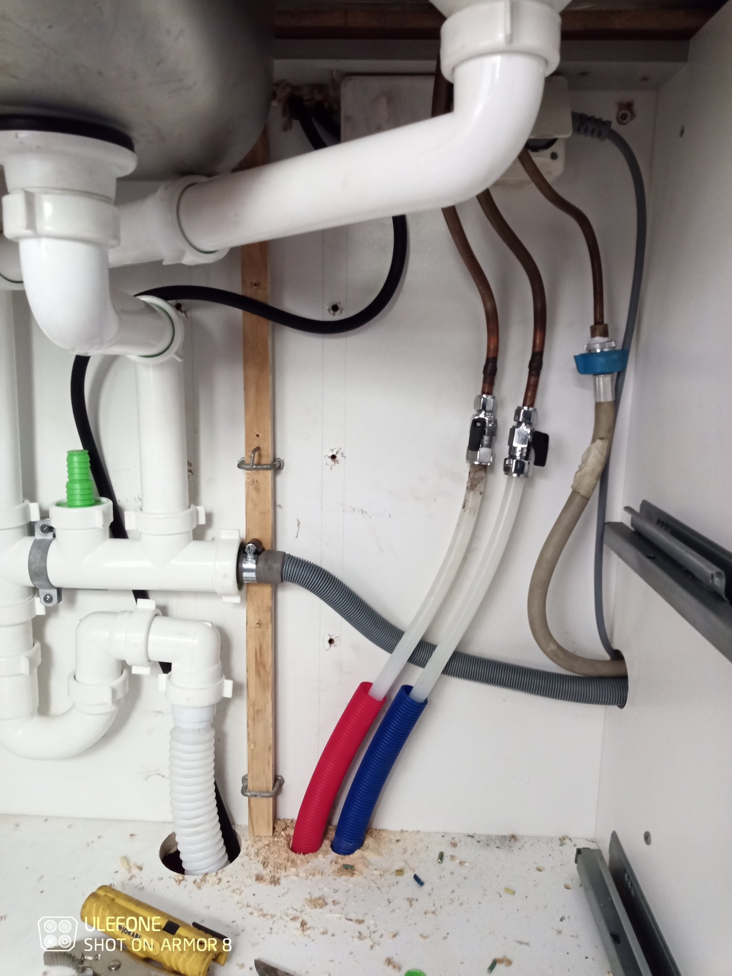 On se ylempänä tuol takemmassa kaapissa, ei mee vesi koneeseen, mitä nyt ehkä jarruttaessa jotain. Periaatteessa vois tehä ton lähemmänki ylemmäs ettei kertyisi rojua putkeen niin helposti