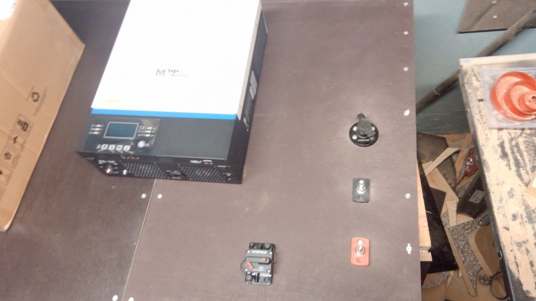 Akut sain myös paikalleen ruumaan moottorin kuskin puoleiseen syvennykseen ja sähköjen rakennusta miettiessäni päätin tehdä keskelle tuollaisen "sähkötaulun". Taulu on saranoitu alhaalta ja salvoilla kiinni yläosasta, saa siis käännettyä hieman auki mahdollisia kytkentöjä varten. Invertteri tulee taulun keskelle ja oikealle puolelle "pikkusähköt" 24v ja vasemmalle tulee valovirtapuoli kun appiukko ehtii asennella. Tauluun tulee myös yksi rasia ruuman puolelle kompuraa varten ja jos tulevaisuudessa jonkun pienen varaajan kytkee tähän. Itse en ymmärrä tuosta valovirtapuolesta yhtään mitään, niin jätän suosiolla koskematta. Rasiat asensin paikalleen väliseinään, että sain tehtyä valmiit paikat. Johtojen vedot tulee matkustamoon tuosta väliseinän kautta.