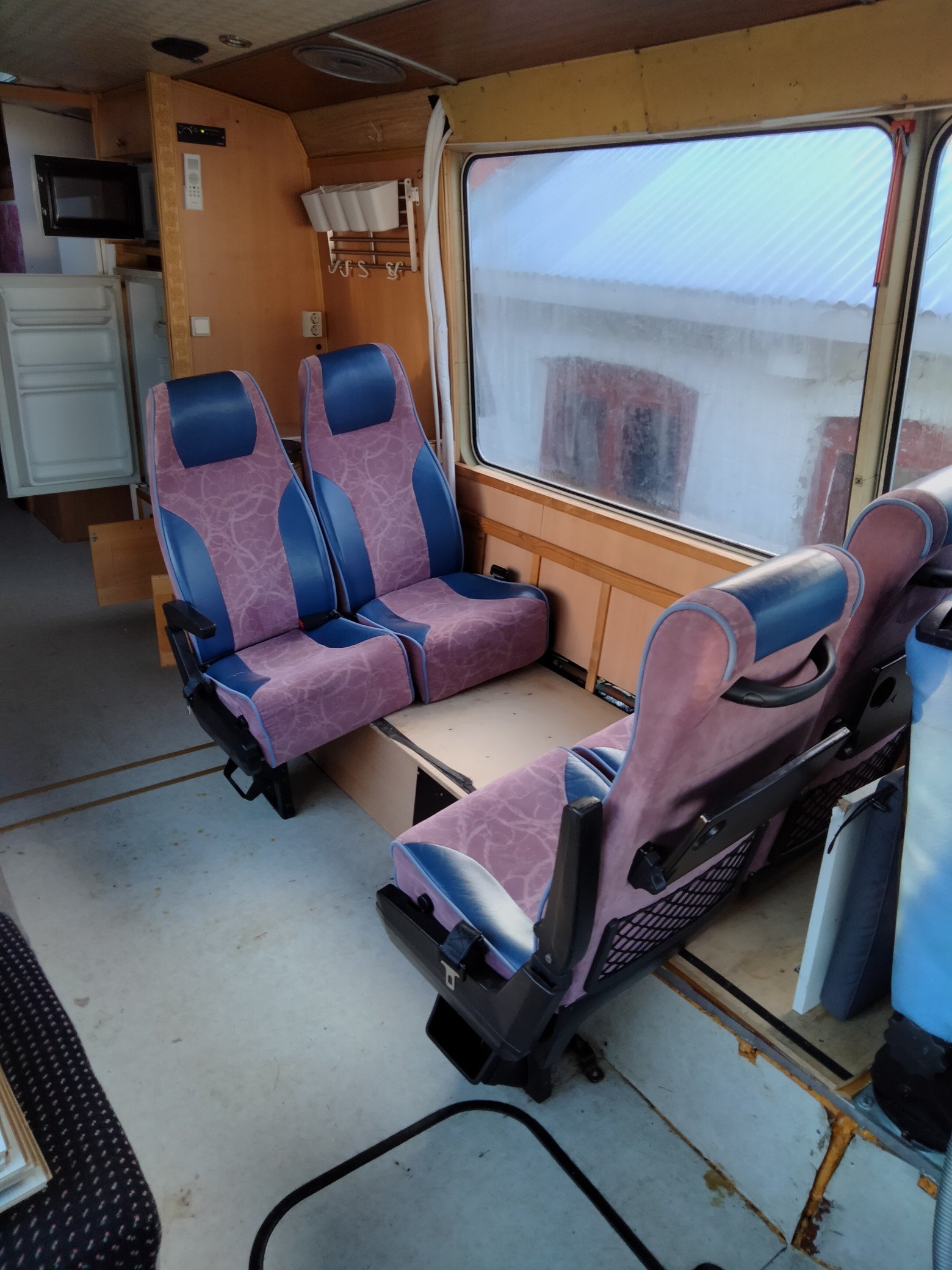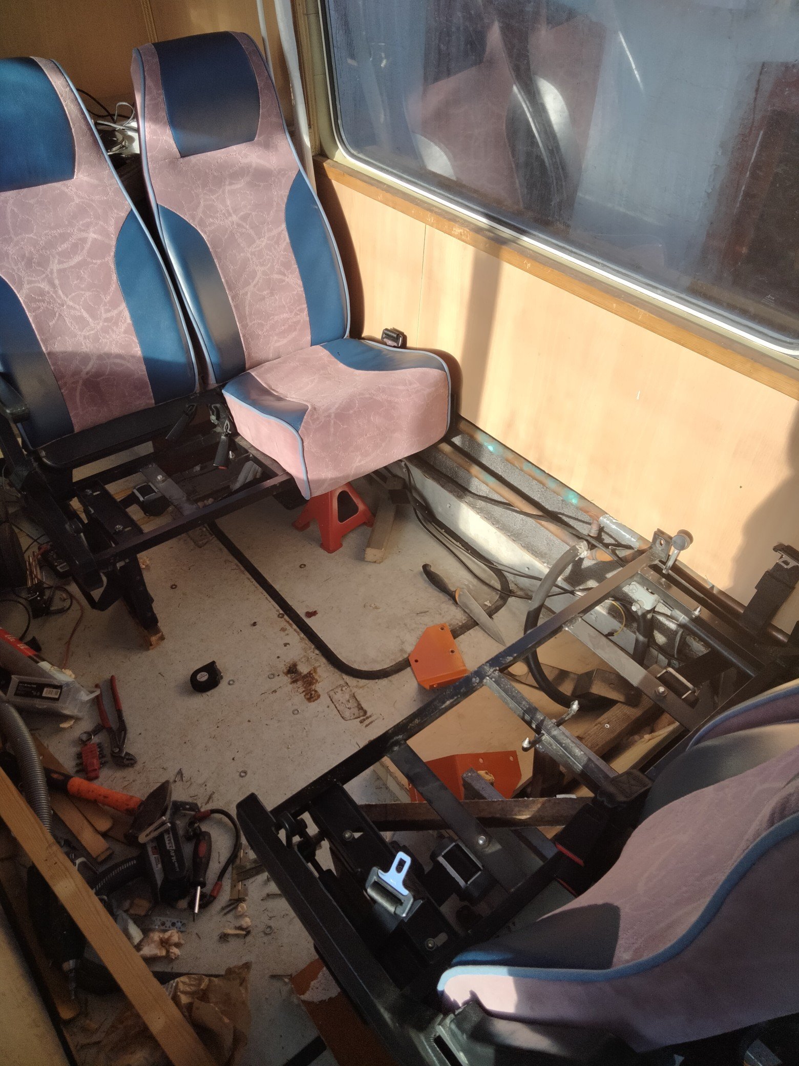 Päädyin tekemään patin lattiaan itse tekemäni penkinjalan piilottamiseksi ja hyödynnän sitä etummaisen penkkiparin kiinnityksessä.