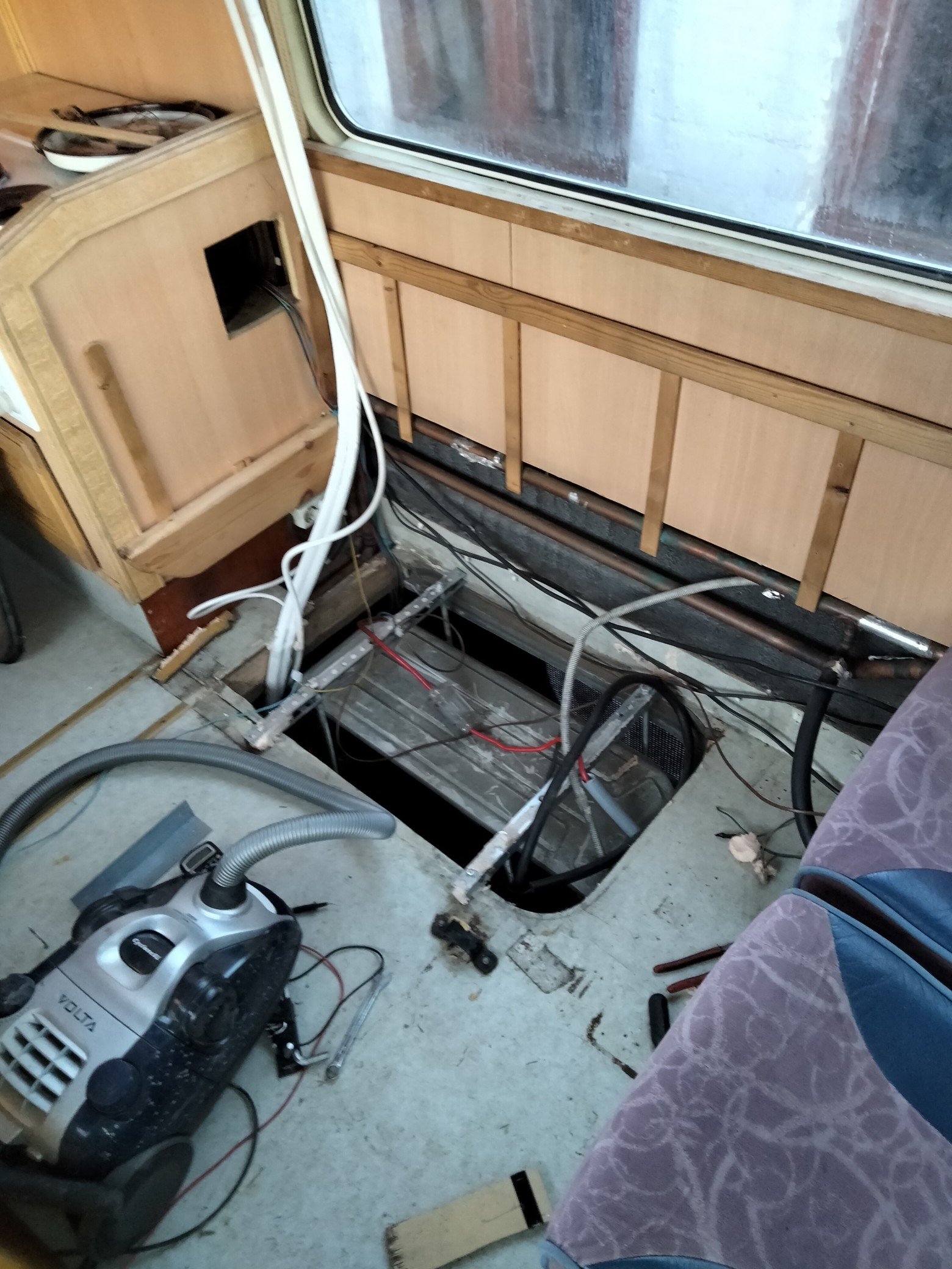 Ja pari muuta muuttujaa vielä, kuten tuossa sohvan alla majailevat starttiakut jotka siirtyivät siihen ilpin ulkoyksikön tieltä ja edellämainitun yläpuolelta käytännössä puuttuva lattia. Akkukotelon jättämä reikä kun on tilkittu pelkällä uretaanilevyllä.
