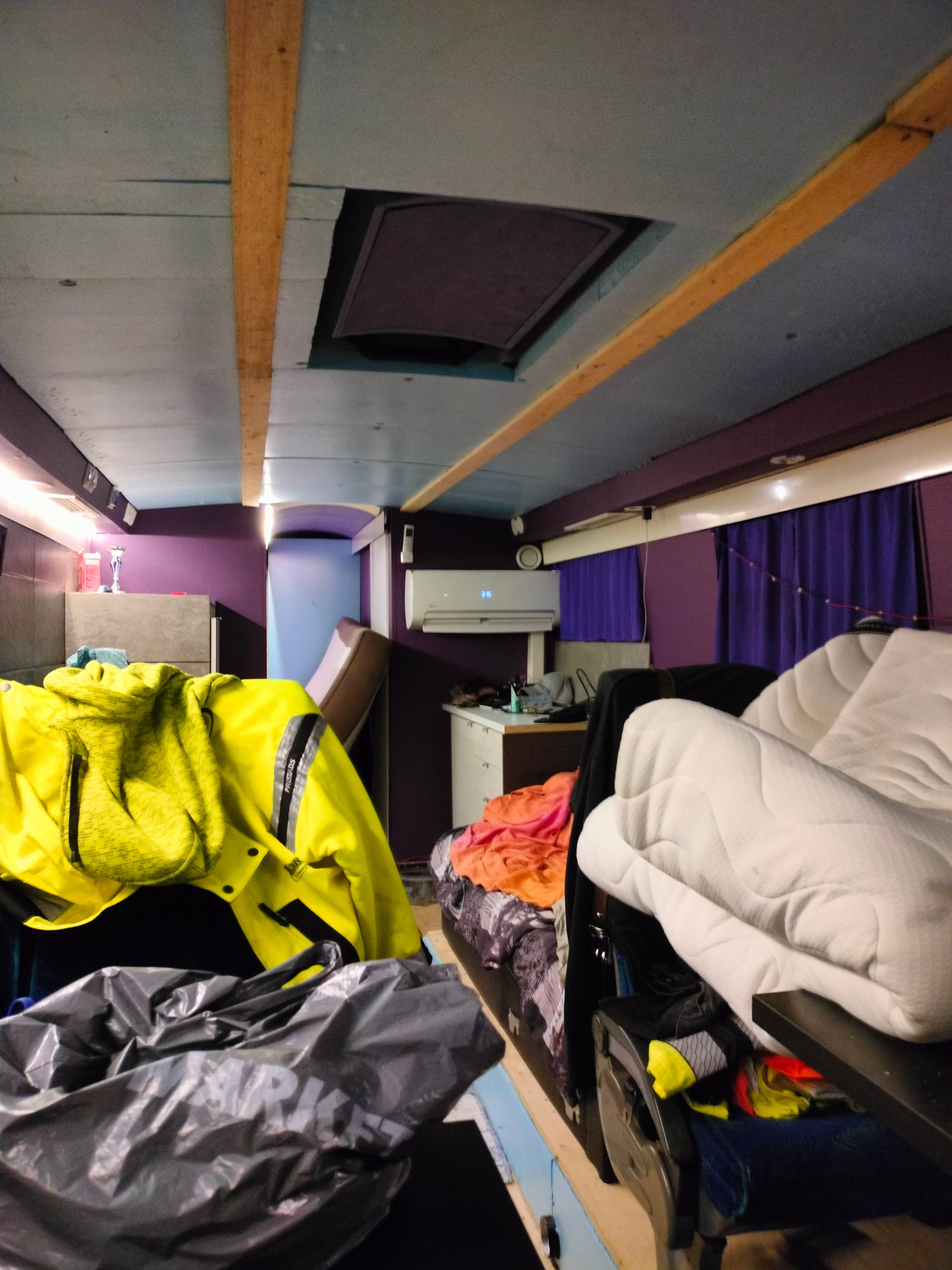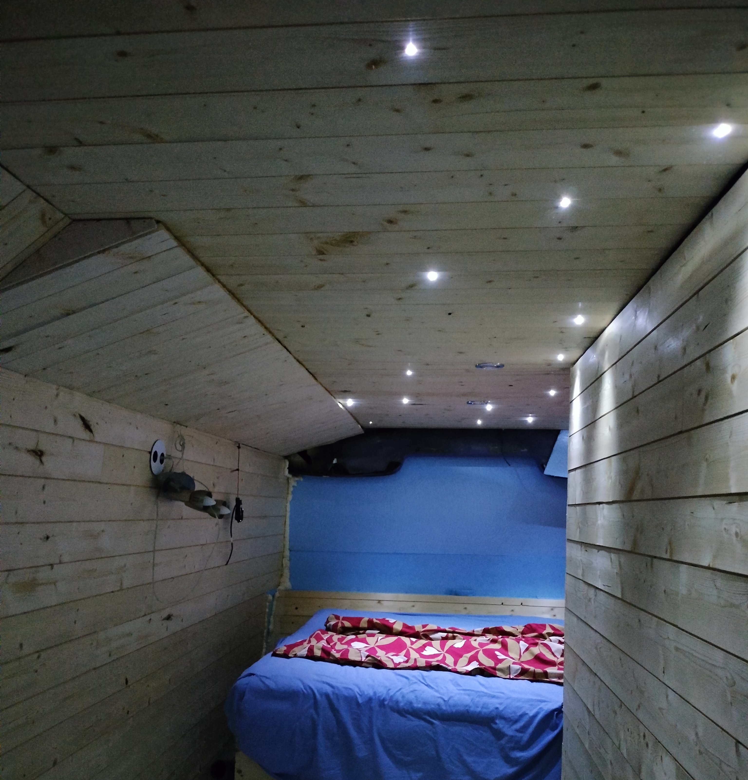 taivaalla ja seinä tehty ohjaamon ja asuin tilan väliin vielä siihen liukuovibtwhdä. Ja perä osa purettu kokonaan korille ja eristetty 80mm uusi panelointi