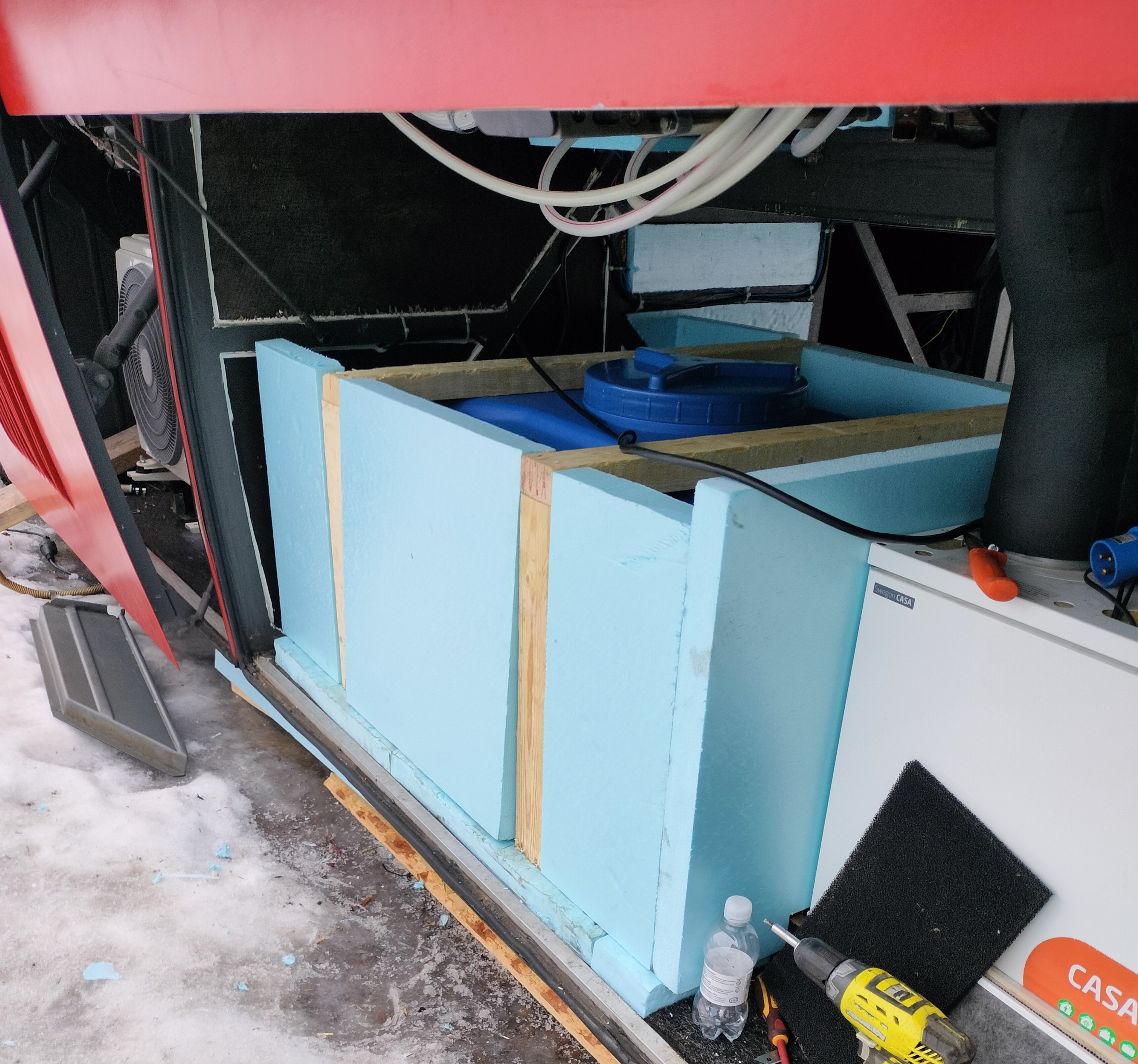 Rupeis seinät olemaan pikku hiljaa valmiina perälle ja laittelin tommosesta köydestä listat, kaapistoja vielä pitäs tehdä perälle ja keksiä peräseinään jotain maisemakuvia tai tai kun sinne koloon asensin omat tunnelma valot. Lattiaan tuli laitettua vinyyli lankku ja andasoitua kulma listaa reunoiksi. Ruumassakin muutoksia kun lisäsin 500l puhdas vesisäiliön ja 500l jätesäiliön kokonruuma eristeety 50mm foamilla ja säiliöille vielä ympärille lisäeristys. Nyt kulkee mukana 790l puhdasta vettä ja jätevettä mahtuu 750l ja asentelin maseraastori pumpun säiliön tyhjennykseen.