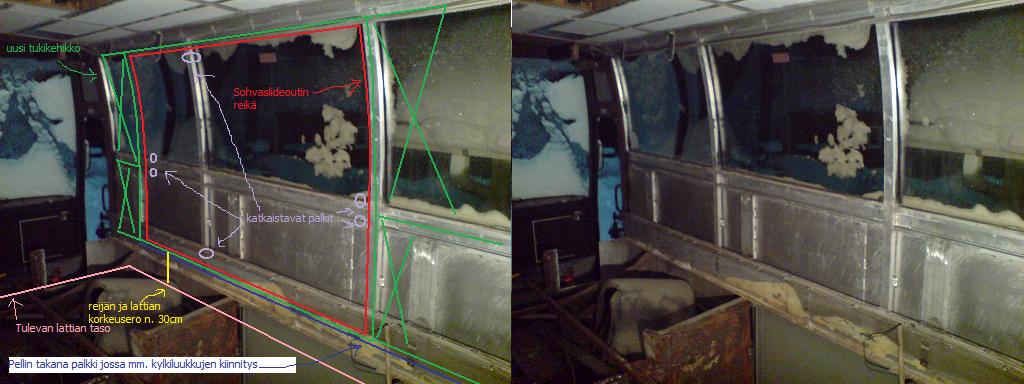 Edit:Vaatiiko tuo poikkeusluvan? Jos, niin luulisin että tiukin tulisi tosiaan pitkittäisillä palkeilla, ja jos se ei riitä, niin noista pitkittäisistä alapalkeista sivuttaiset tuet tavaratilassa alapalkkeihin keskelle. edestä ja takaa. Voi tulla vaan liian jäykkä tuosta kohtaa :lol: Kiertojäykkyyttä tulis varmaan 600% siihen "ikkunan välille".