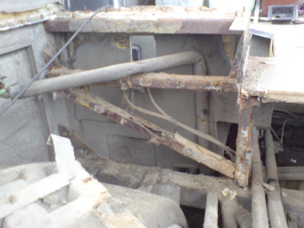 Äänieriste, mitähän pahvimaista sitkeää tavaraa lienetkään, oli niitattu suoraan noihin palkkeihin kiinni. Kostea suolalla kyllästetty maantietomu palkin ja märän äänieristeen välissä ei ainakaan paranna rautapalkin kestoa. Tuo vinopalkki on katki alareunastaan ja pystypalkki samaten. toisella puolella sama tilanne. Eli ei ole hirmuisesti kantavuutta tuolla himmelinosalla, kun on kiinni ainoastaan päistään korissa.