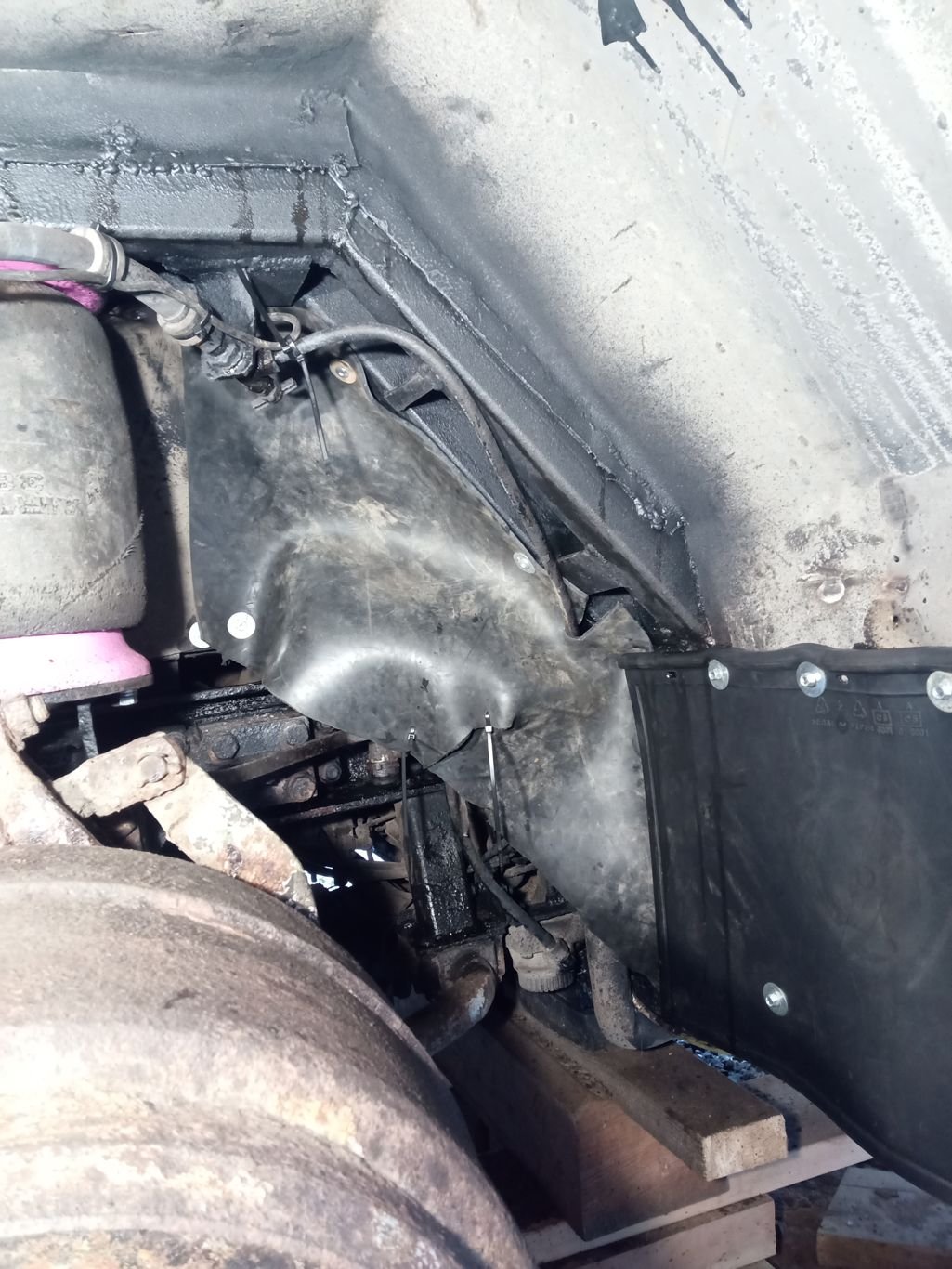 Semmonen siitä nyt tuli, tarkka saattaa huomata että korvasin osan "sisälokarista" putkien välistä kiinteällä pellillä, jää huomattavasti vähemmän kurapiiloja noin tehden kun rakenteen päälipuolelle ei pitäisi päästä kuraa (juuri) lainkaan. Samalla teen sisälokarin erilaiseksi että saa helpommin irti tarvittaessa. Saa nähdä kuin toimii käytännössä...
