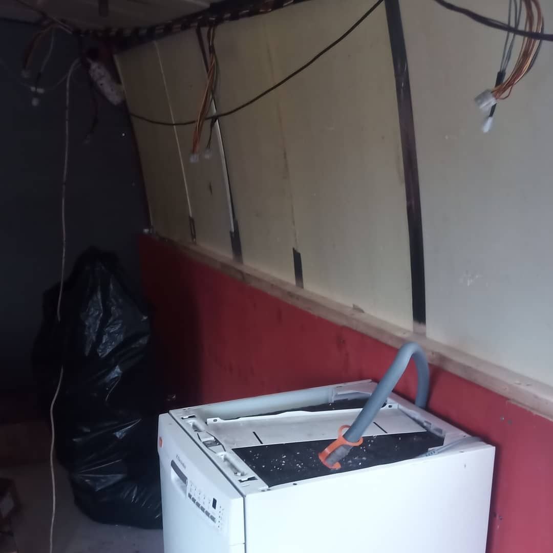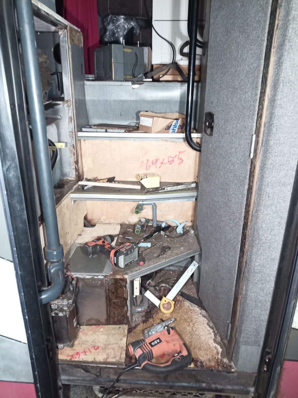 Portaiden vanerien ruuveista ei ollu enää kantoja jäljellä, kun alumiinin, raudan ja rosterin liitto oli tuhonnut ne, joten ainut keino oli väkisin. Onneksi porrasaskelmat oli kovinta ja paksuinta, joten ne jäi ehjiksi kun ajatuksen kanssa rikkoi. Seinävanerit meni suurin osa uusiksi.