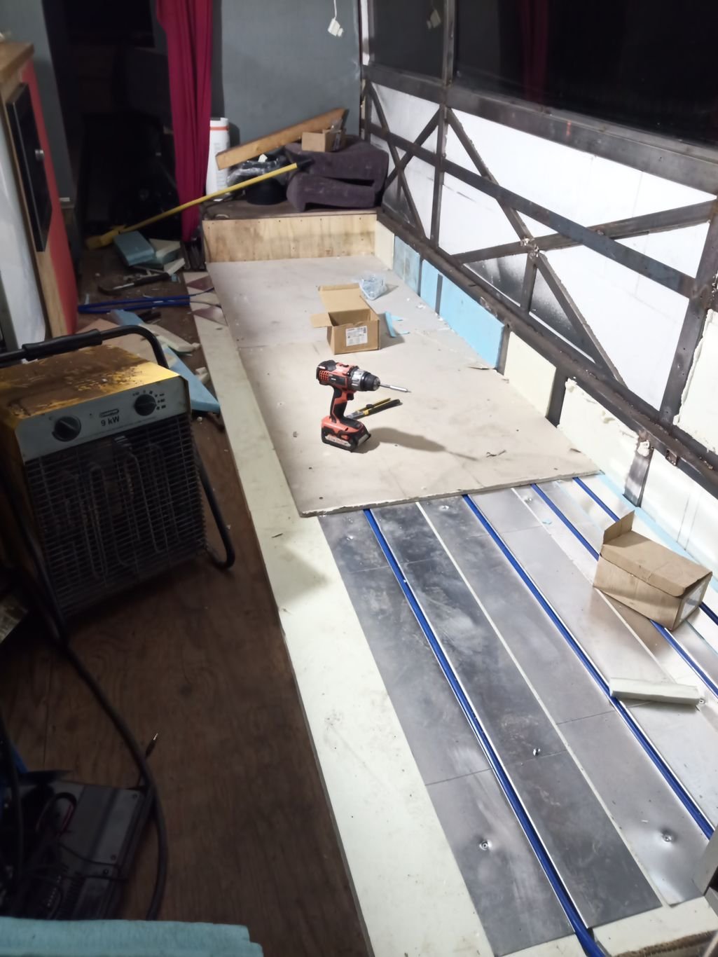 Siihen tulee 4 penkkiä ja pöytä ruokailua varten. Klo 21.00 veljekset suunnittelee lattialämmitysen asennusta. Klo 00.00 patteri loppu ukoista ja porakoneesta, aika painua nukkumaan. Aamulla pitäs nykästä seinään eristeet kuntoon, lattiaan ja seiniin pinnat ja penkit takaisin, niin keulan matkustustilat ois melko lailla valmiit.