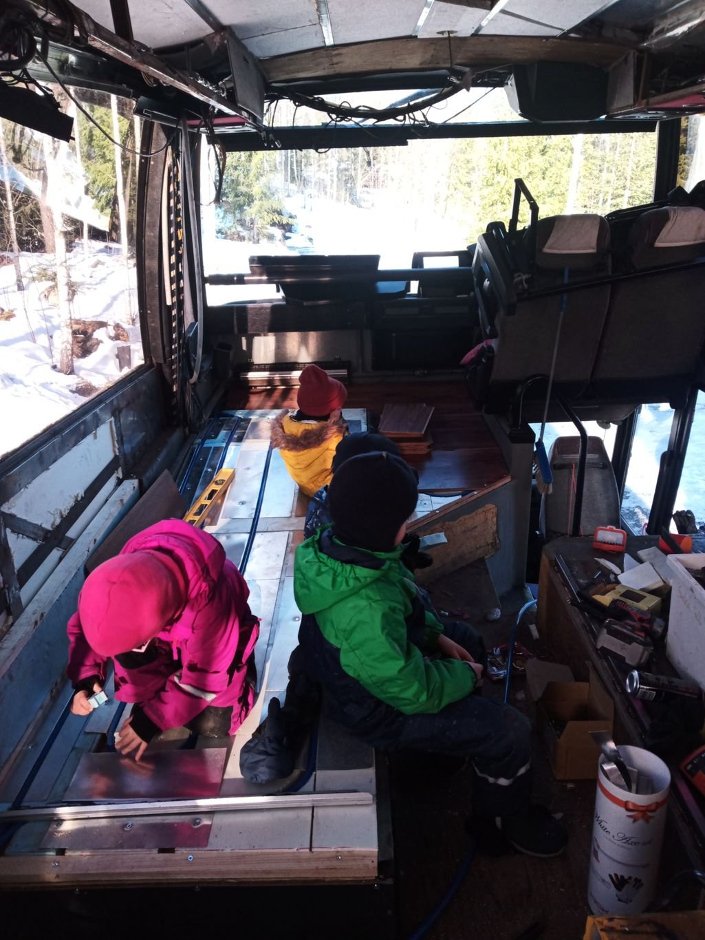 Vähän jo vanha kuva, lapset on isi kanssa suunnittelemassa lattiarakenteita. Nyt tuossa on lattialaminaatti ja penkkejäkin taas paikallaan.