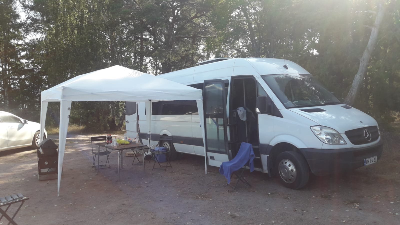Tuo MB on kätevä retkeilyauto. Pöytäryhmä ja 6 tuolia menee takakonttiin kurakaatien väliin säilöön. Silti jää 70cm pitkä tavaratila koko takaovien leveydeltä.