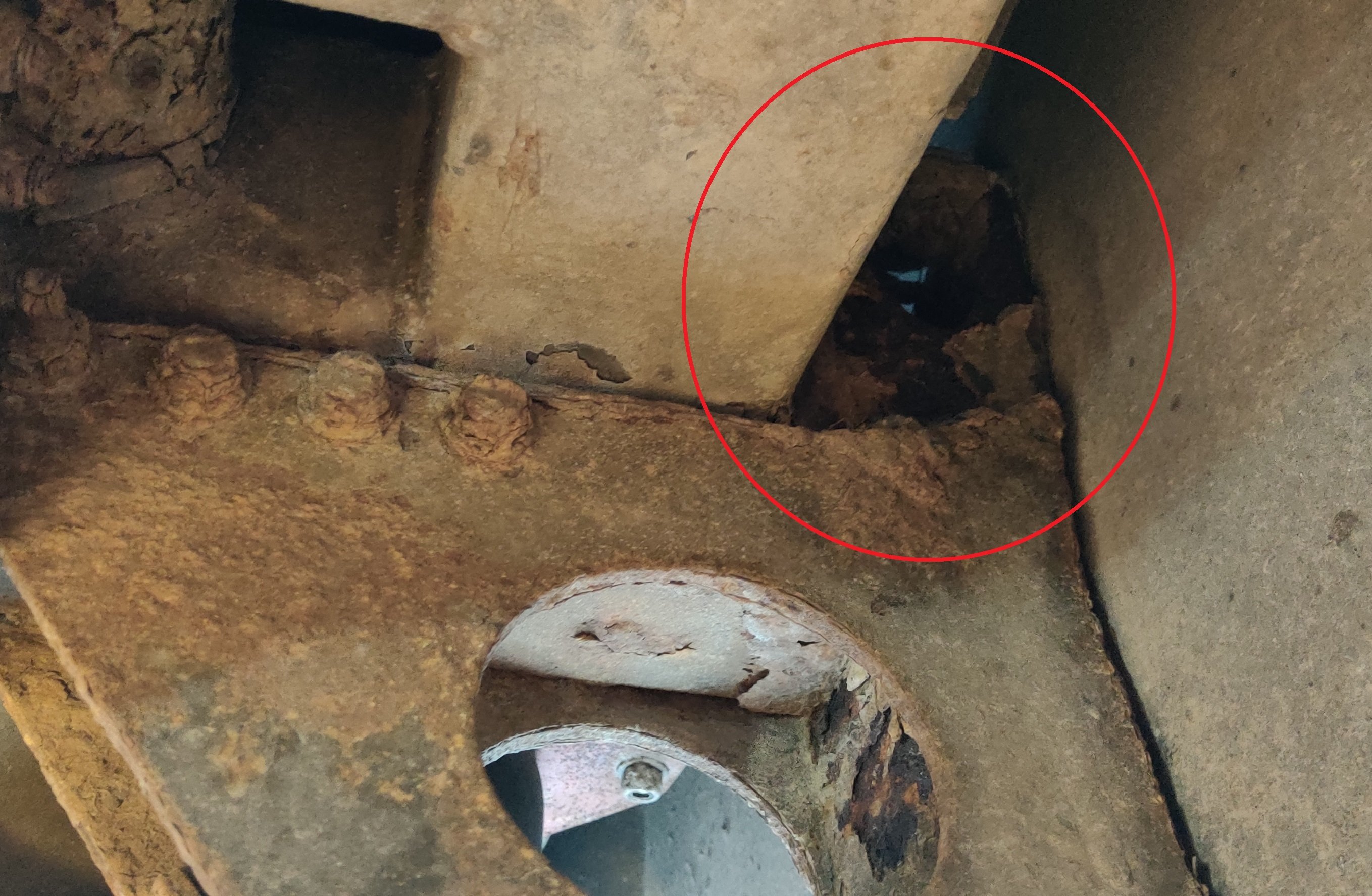 Seuraavaksi muiden vaiheiden jälkeen mentiinkin konttorille kikkailemaan, jossa tuomio oli hylätty. Sivukoteloiden alaputket ruostuneet, oikealla takana ylhäällä reaktiotangon päätypala ruostunut, oikean takapyörän laakeri välyksellinen ja 35% heittoa takajarruissa. Olen tässä kahden vaiheilla, että teenkö itse vai ostanko tämän palveluna jostain. Ohessa kuva tuosta ruostuneesta päätypalasta, johon katsuri sanoi, että pitäisi asentaa hitsauskoneella nelimillistä peltiä. Tarviiko tuo takapyörän laakeri vaihdettaessa jotain prässejä tai muita erikoistyökaluja?