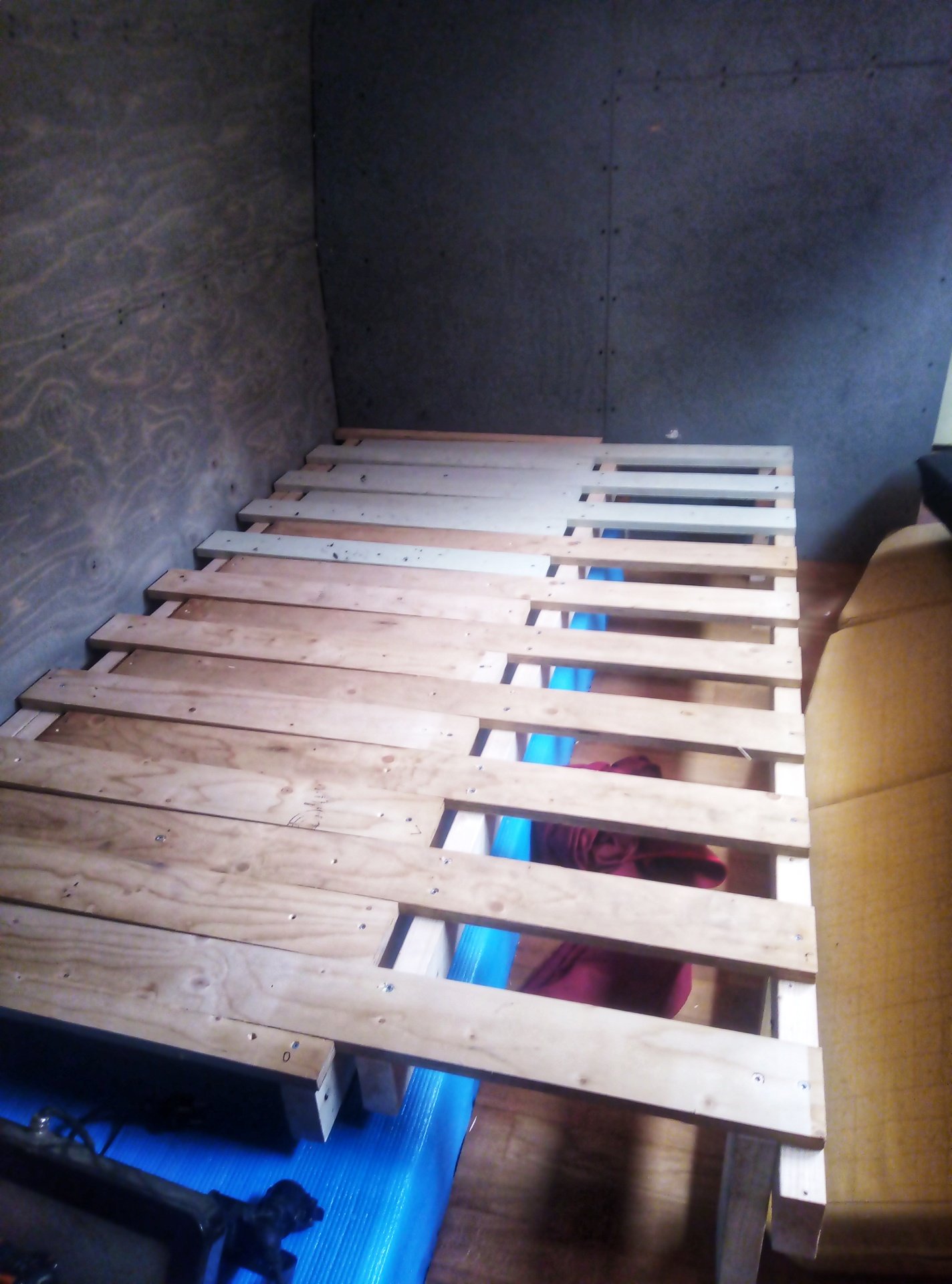 Tärkein osa asumisen kannalta, huomattu muutaman pihassa nukutun yön aikana, täytyi tehdä ensin. Tuommoinen parisänky siitä tuli, levitettävää mallia, 120-200 x 200 cm. Materiaalina kaikkea bussin mukana tullutta vanhoista sängyn rungoista. Levitys on tärkeää sikäli että kulkeminen taakse on helpompaa, kun sänky kapealla. mutta taas tässä vaiheessa, kun yksi vauva nukkuu vieressä, leveässä sängyssä on enemmän tilaa nukkua. Kai tuohon tulee 2 x 80 cm patjat noin niinkuin omaan käyttöön, mutta voi tarvittaessa muuttaa helposti jatkossa.