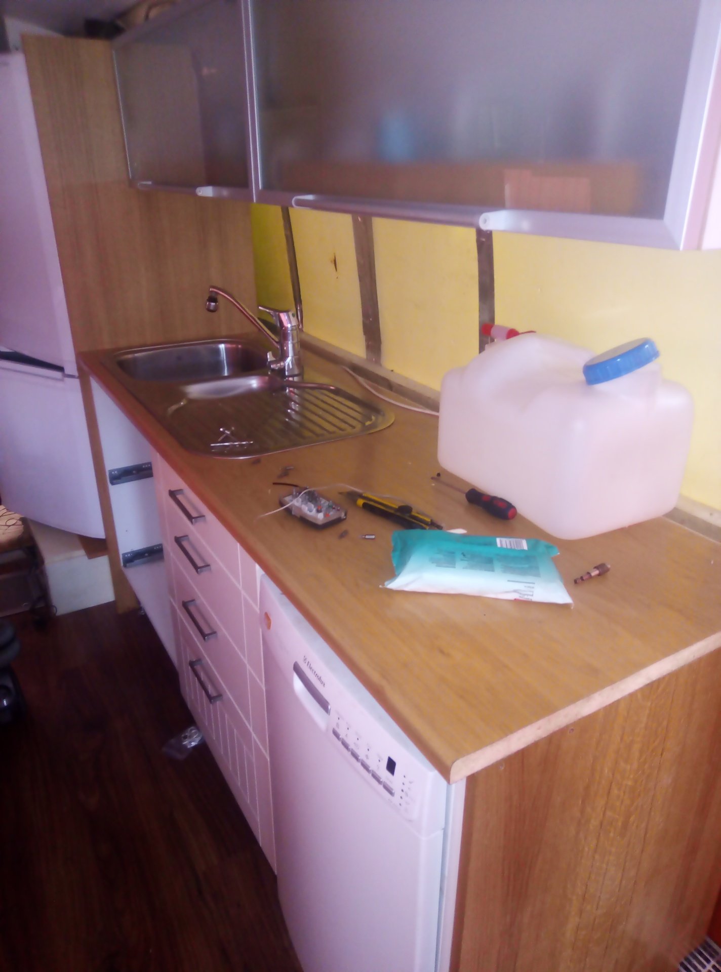 Seuraavaksi sitten toiseksi tärkein, pöytä ja etenkin tiskiallas, jotta on jotain sellaisia paikkoja, joihin 1-2 vuotiaat ei yllä helposti, mihin laskea ruokia ja astioita. Pikkuveljellä oli sopivasti keittiöremontti, kiitos pöydästä ja hanasta
