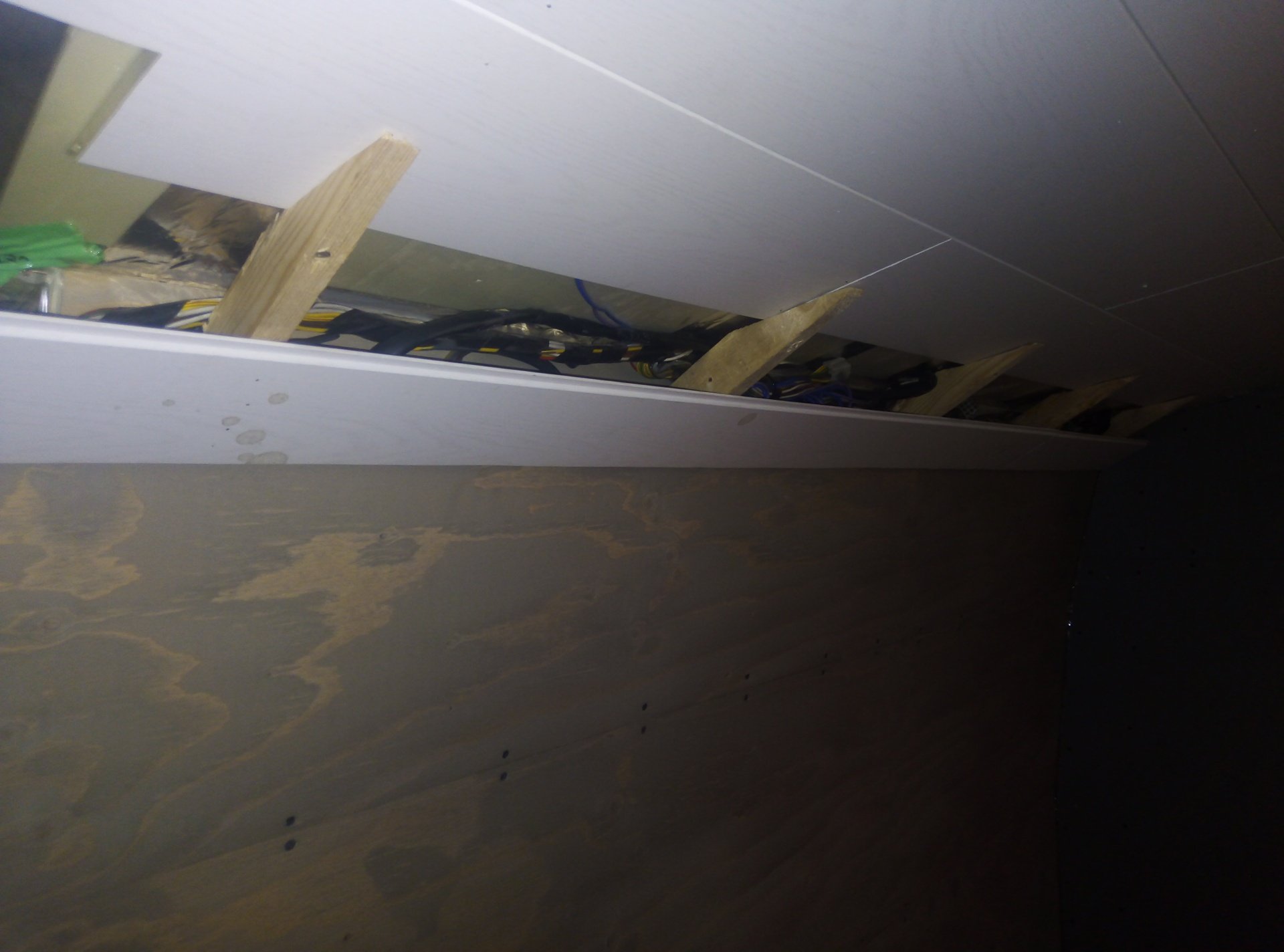Makuuhuoneen katossa eteen tuli yksi teräksinen vinotuki, siispä tein johdoille vinon kotelonkin. Eikä tarvi edes listottaa, kun tuohon laittaa eteen täysileveän kattopaneelin, sen urospontti osuu kattoa vasten tiiviisti, ainakin teoriassa.