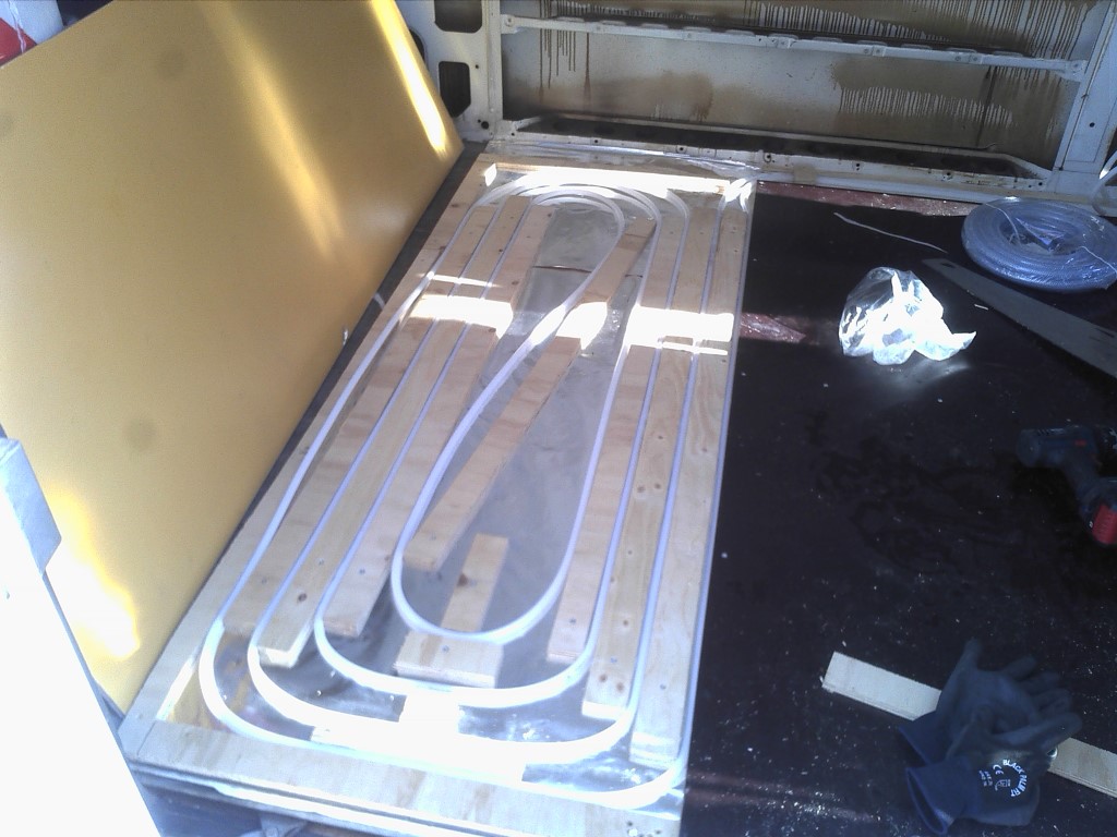 Tämä 2-piiri tulee käytännössä penkin alle, joten pysyypähän vedet ja tavarat lämpimänä, tai mitä sinne sit tuleekin. Tavaratilaan nyt ei tullu lattialämpöö ainakaan vielä... Penkitys on epäselvä edelleen, vähän kattelin tuon vaunun penkkejä/paljoja sillä silmällä vaikka transun jakkarat on kai tulollaan =O
