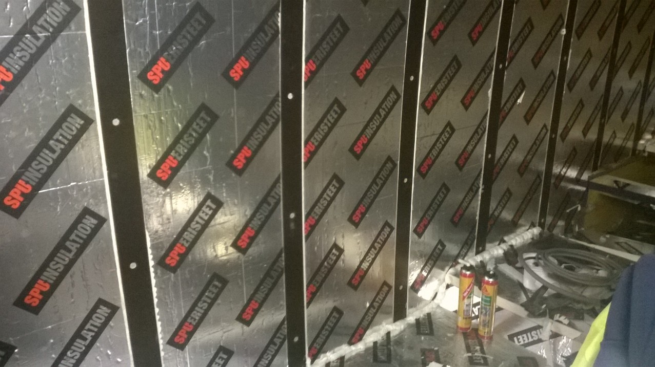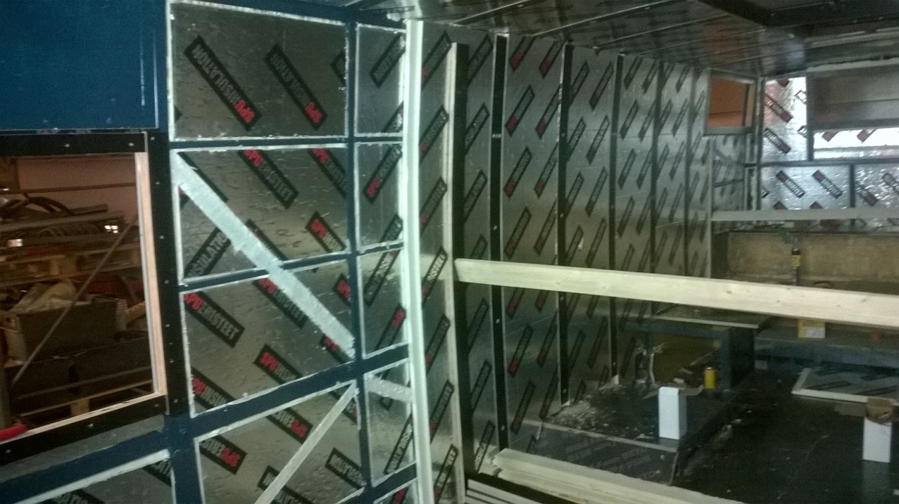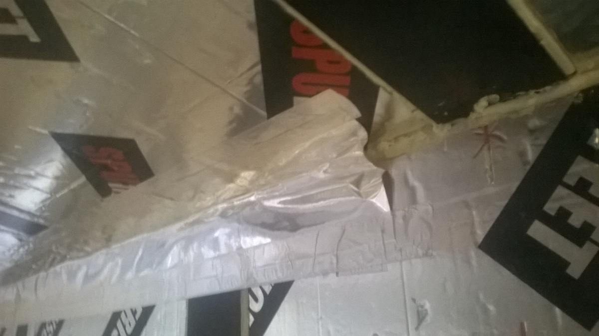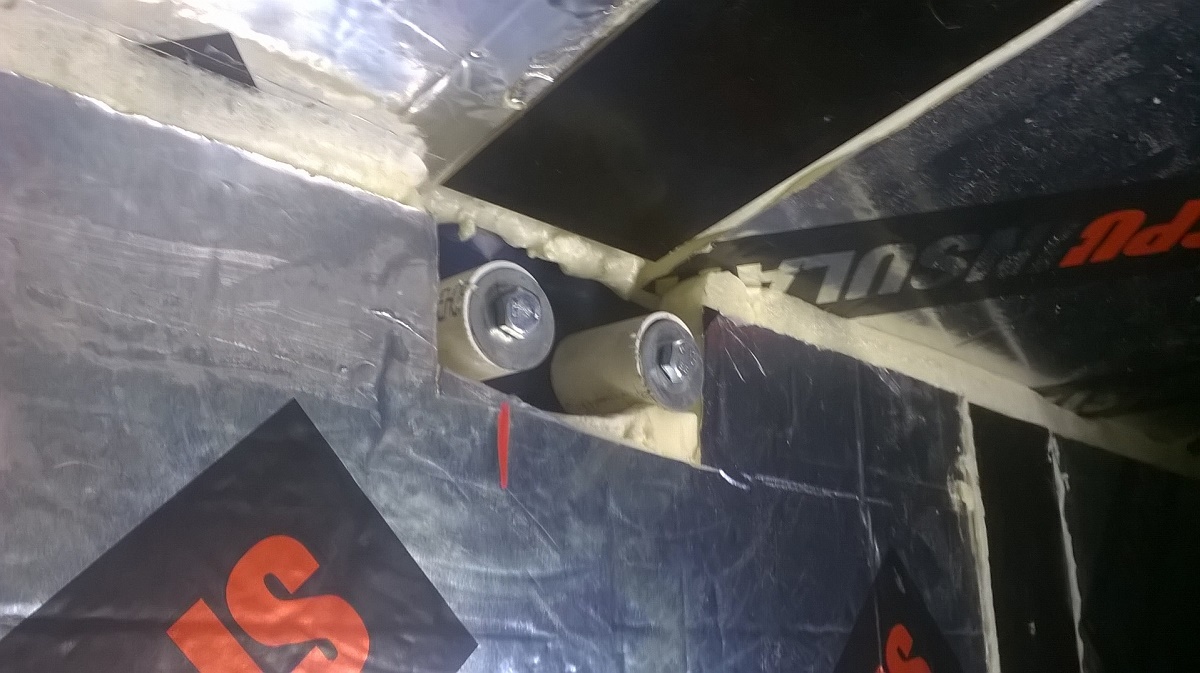 Nytte joku saattaa ihmetellä et "mikä ongelma on noissa ruuveissa"... Niissä ei sinänsä olekkaan se "onkelman ydin"... ne kestää kyllä... mutta ku mää "suuressa viisaudessani" ajattelin...(tiiättä mitä mää kädelläni teen... :D nostan sen taas virheen merkiks) no enivei... Mää siinä "älyn puuskassa" arvelin että pienennän viel tuota "kylmäsiltaa" ja ruuvasin noi soirot "villinä" pystytolppien väliin... eli noi vanerisoirot on kiinni niissä välivaakaraudoissa...ja pysty putken kohdalla on se 40mm spu-levyä... ja eriste on ohuimmillaan juurikin siinä vaakaputkulaisen kohdalla... (vähän niinku ristikoolaus) Yks huono kuva lisää... :)