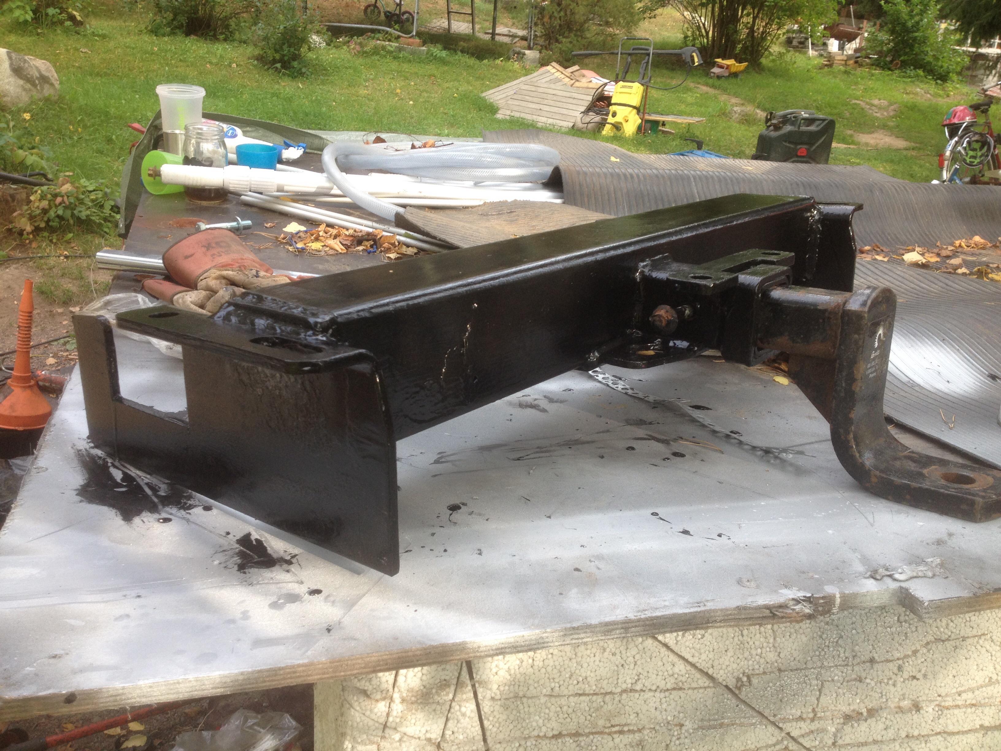Tiistaina oli vielä tämmöstä. Tänään on takapelti liimailtu paikoilleen ja puskuri nostettu perään. Ennakkoaavistuksista poiketen ei puskuria tarvinu koukun kohalta loveta. Sillee jee.
