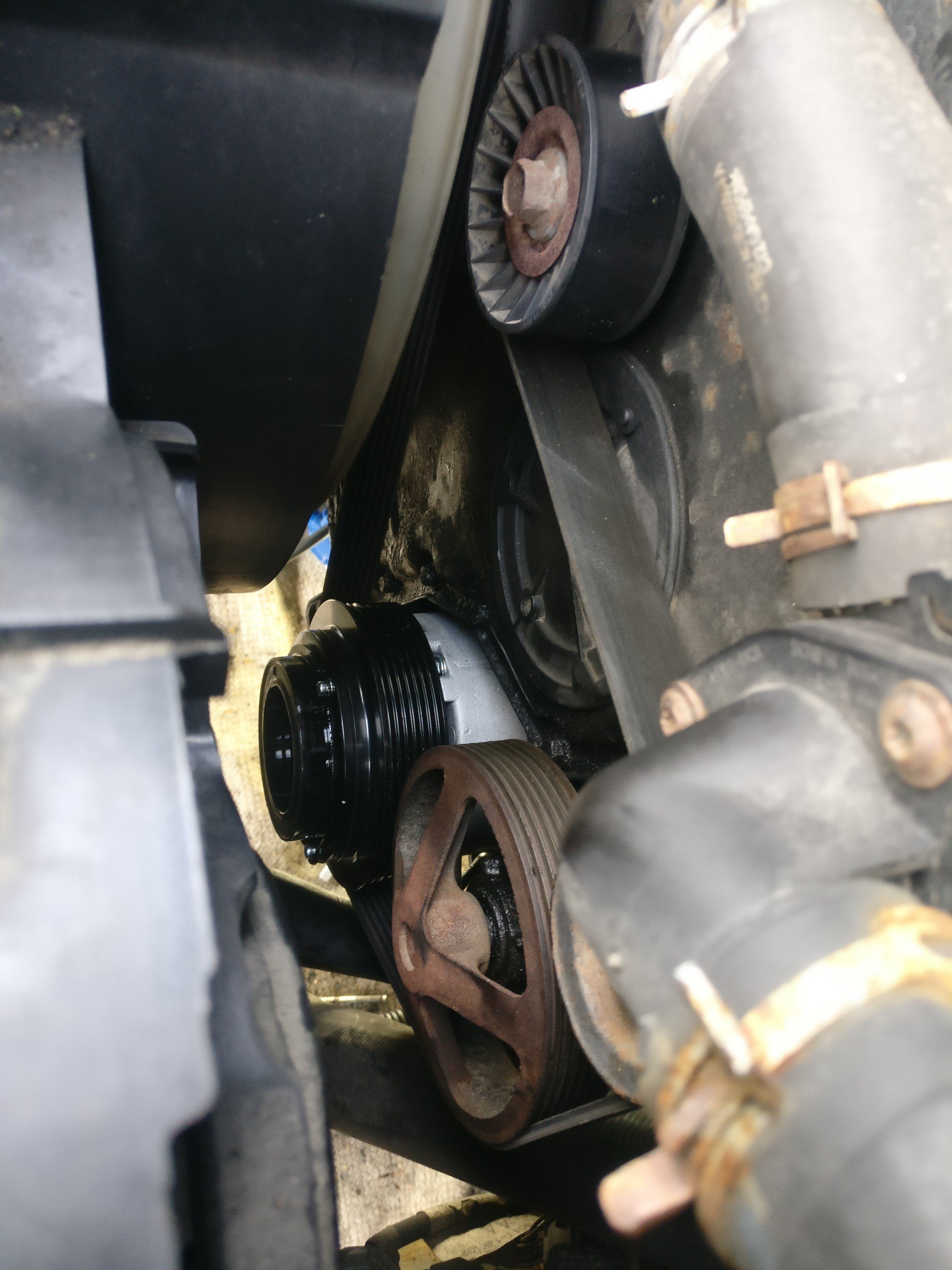 Ilmastoinnin kompuran sain vaihdettua eilen. Olihan mielenterveyttä koetteleva remontti. Kompura on alimmaisena lohkon kyljessä vesi- ja alipainepumpun alla. Kylmäaineputket on kiinni kompuran päällä. niihin ei mahdu koskemaan kompuran ollessa paikallaan vaan se täytyy ensin irroittaa kiinnikkeistään ja sitten käsikopelolla välistä irroittaa kaksi M6 pulttia. Ja sama laulu tietysti takaisinpäin.