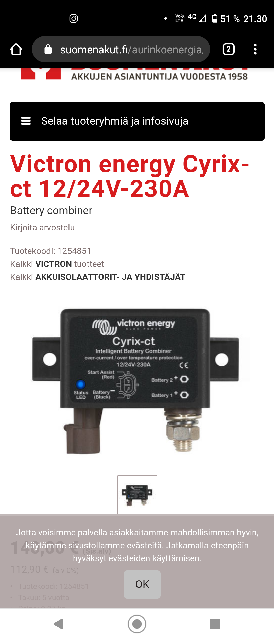 Jep, tekee saman mutta kestää enemmän virtaaRosvolinna kirjoitti: ↑16 Joulu 2020 23:08 OK - tuo tekee saman kuin Blue Sea. Varmasti hyvä laite tuohon tarkoitukseen. Kiitos kuvasta - nyt kukaan ei mene harhaan. Tuolla webissä on kaupan ties millaista separaattoria, jotka eivät osaa erottaa toisistaan kuin Visan ja Pay Pal:lin