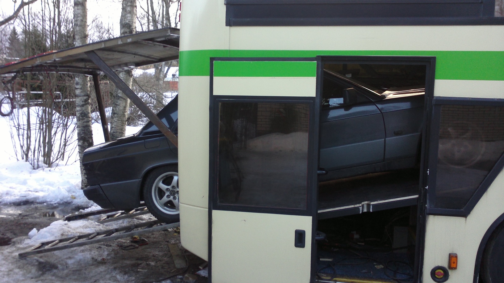 Auton paikka tulee alakabiiniin. Joutui toki purkamaan ylälattian ja nostaa sen ikkunanpielen tasalle. Myös vessa jouduttiin purkamaaan että sai pituutta takatilaan. vessa oli alakerran portaikossa ja nyt sen paikka siirtyy eteenpäin.