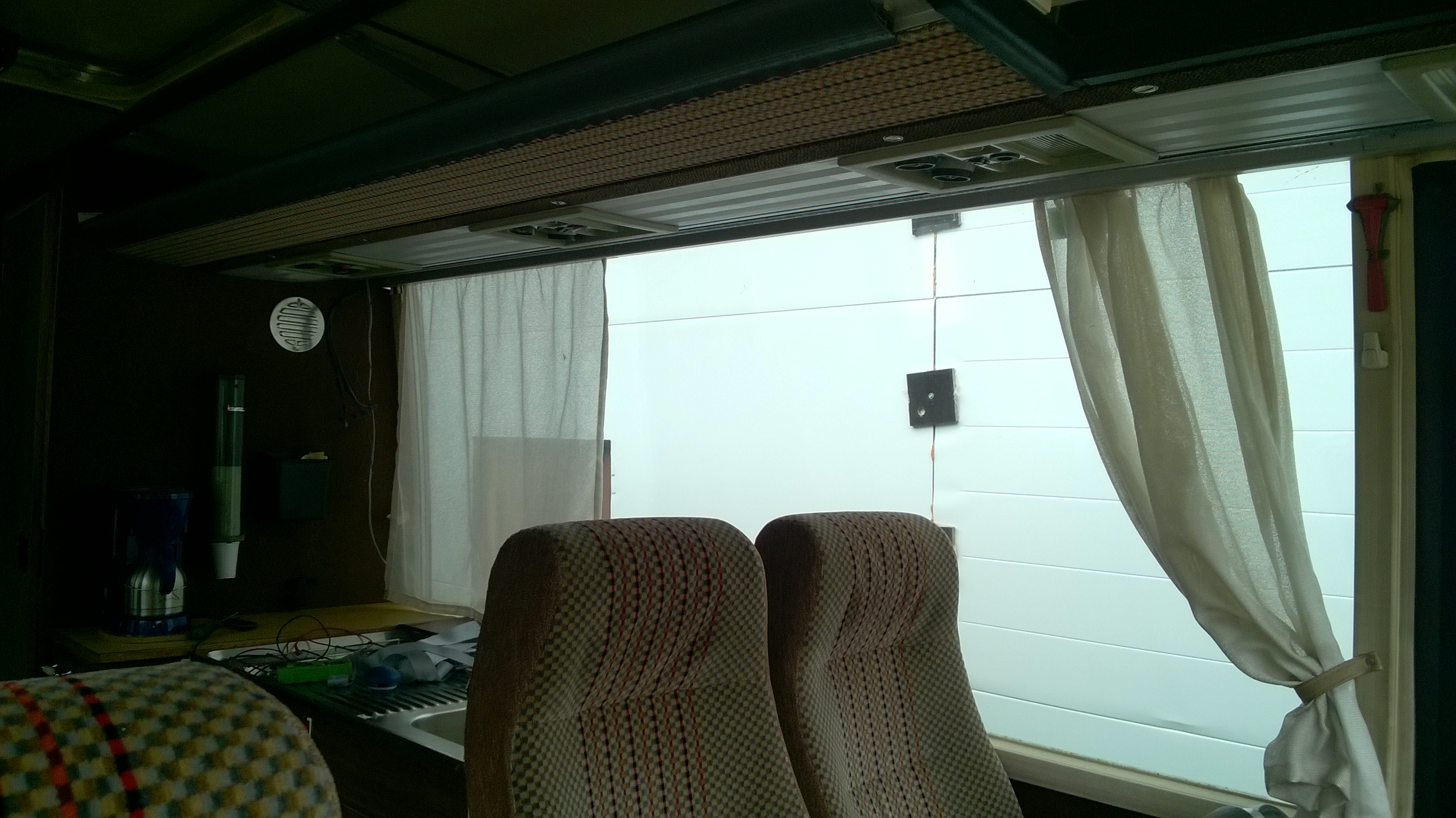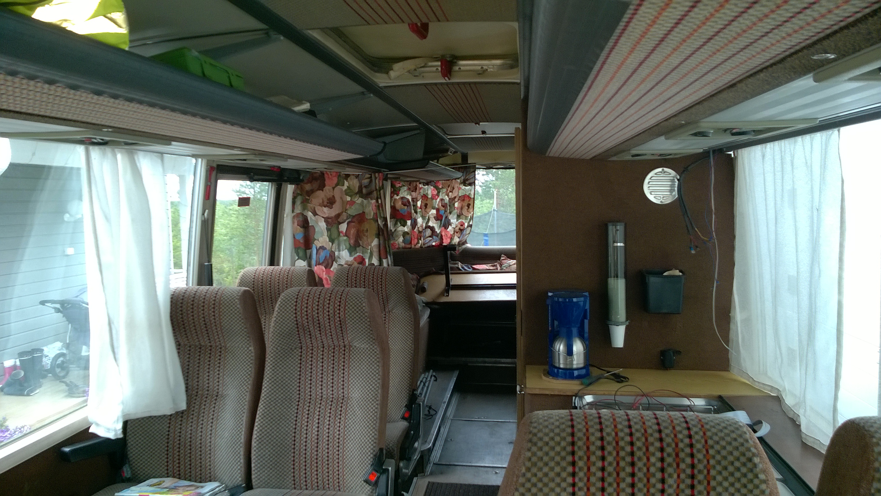 Varustuksena kahvinkeitin 24v, kaasuhella ja lavuaari mistä reikä suoraan pihalle :) ei oikein minkäänlaisia valoja saati hupisähköjä. Ei kunnon pöytää, vain irtonainen, liian matala, reilu a4 kokoinen "pöytä". Toki wc löytyi valmiina. Siitä plussaa.