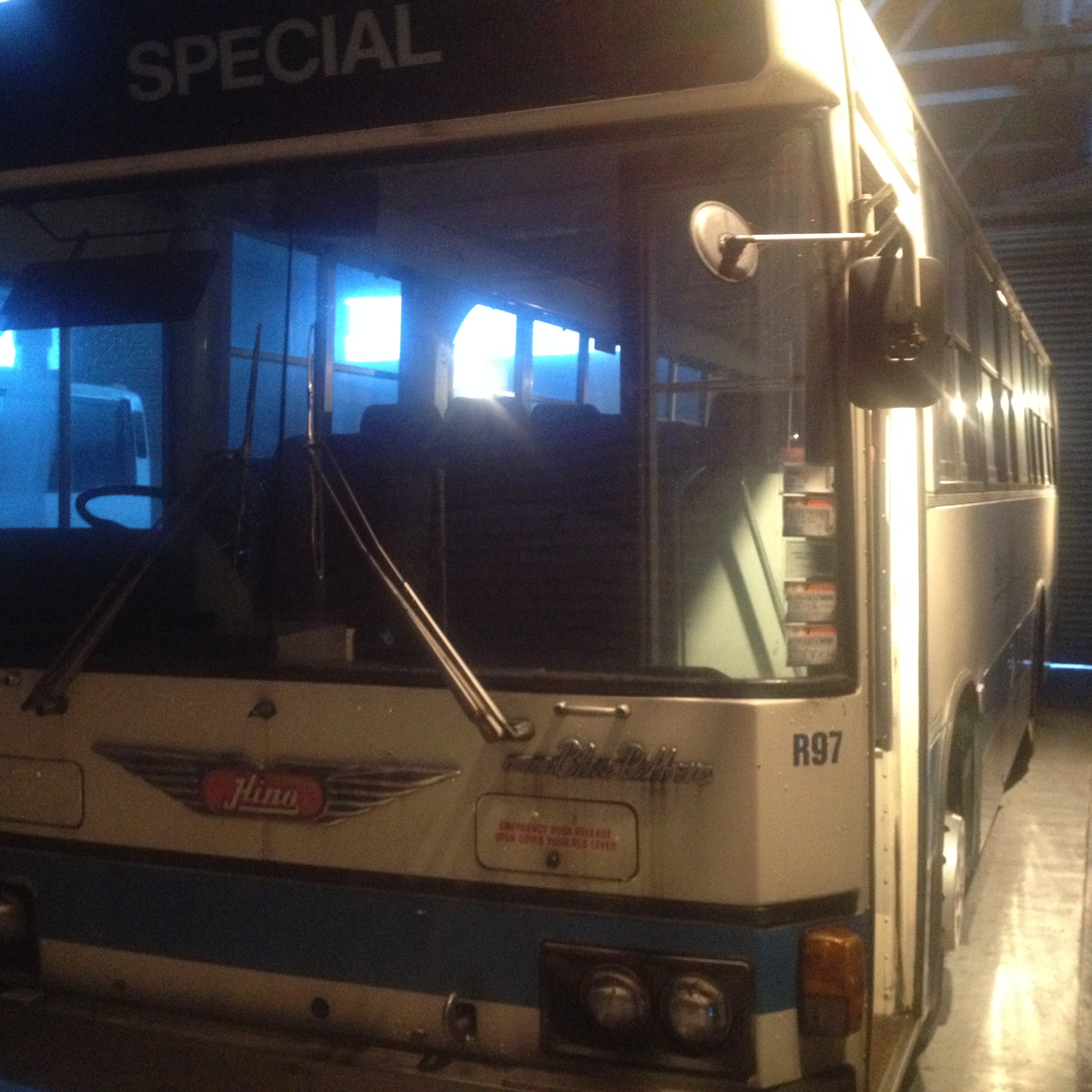 Kone on Hino M10U 9.9l, 230ps, vapari. Älyttömän luotettavassa maineessa. Toi on ollu noilla 15-vuotta, eikä oo koskaan tarvinu tehdä mitään remppaa. Toisaalta näillä viritysasteilla alkaa tommonen 300 000 ajettu kone just vasta käymään nätisti! Nää on suurimmaks osaks Japanista harmaatuotuja vehkeitä ja siellähän kalusto seisoo pääasiassa jonossa. Sen jälkeen näillä kavereilla lentokentältä geyshirille ja takas ja loppuaika kouluajoa, vähän taajaman ulkopuolelta koululle ja illalla takas. Koulukyydeissä bussi ei saa olla vanhempi ku, tänä vuonna 1991. Laske siitä, ite en osaa - kello on yli yheksän illalla. Ylimääränen kuitenki...