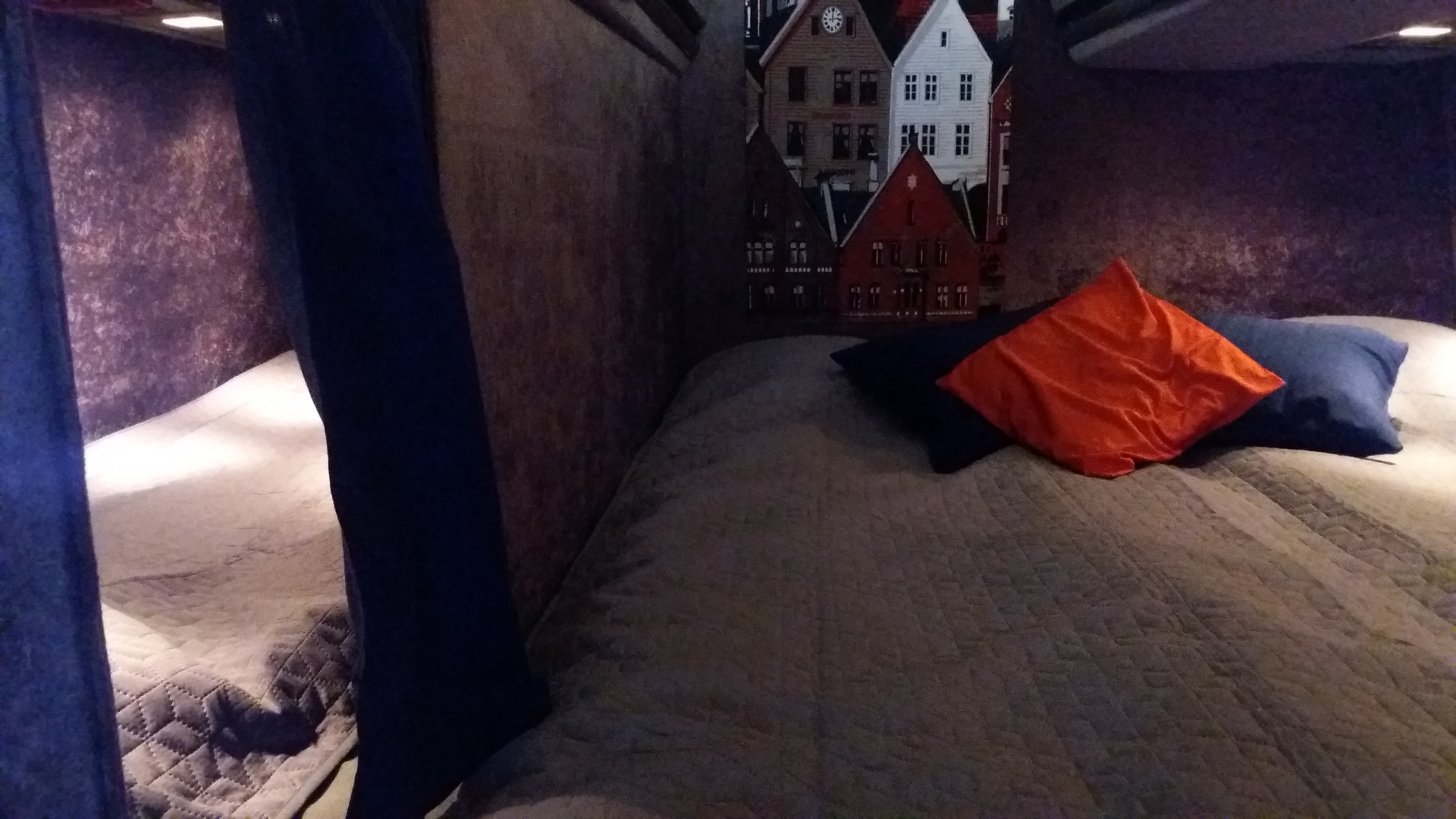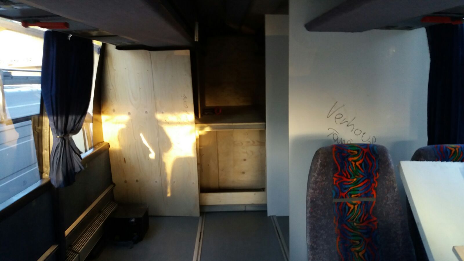 toisessa reunassa väliseinällä erotettu ykköspunkka. Alla oleva aukko on alasängylle jossa nukutaan poikittain autoon nähden.