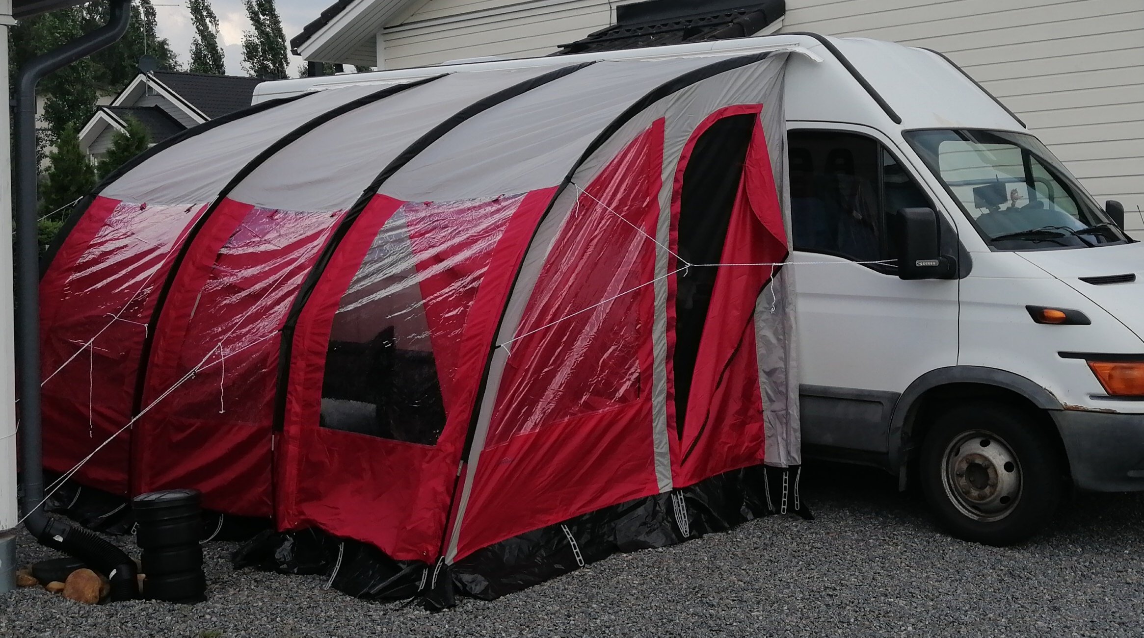 Lisäystä tähänkin projektiin. Etuteltta tuli haettua ja anoppilaan pihassa kauhulla testasin menikö rahat hukkaan. Ei mennyt. Nyt on 4*2 metriä katettua ulkotilaakin. Mattoa suunnittelin lattiaan mutta vielä ei kelit sallinut. Jospa tällä viikolla sit. Sinällänsä helppo laittaa toi matto kun vaneri on irti lattiasta niin sohva veks, vaneri irti, matolle liima ja leikkuu reunojen mukaan ja vaneri takasin paikalleen. Nurkkiin tulee listat mitkä pitää vanerin paikallaan ja saa pois jos/kun tulee mätä vikojen korjauksia. Seuraavaksi alkaa seinien suunnittelu et millä niitä vähä eristäis. Mietinnässä oli lentokonevaneri. Ohkosta tars olla että taipuu kun ei seinät ole suorat. Mites arvon hullut olette eristäneet omia laitteita niin ettei tarvis pelätä heti kaiken kondessiveden ja kosteuden pehmentävä koko laitetta. Niin ja ikkunoita jos jollain sattuu lojumaan varastoissa niin kahta saa tarjota. Sivuoveen ja vastapuolelle seinään olis ikkunat hakusessa.