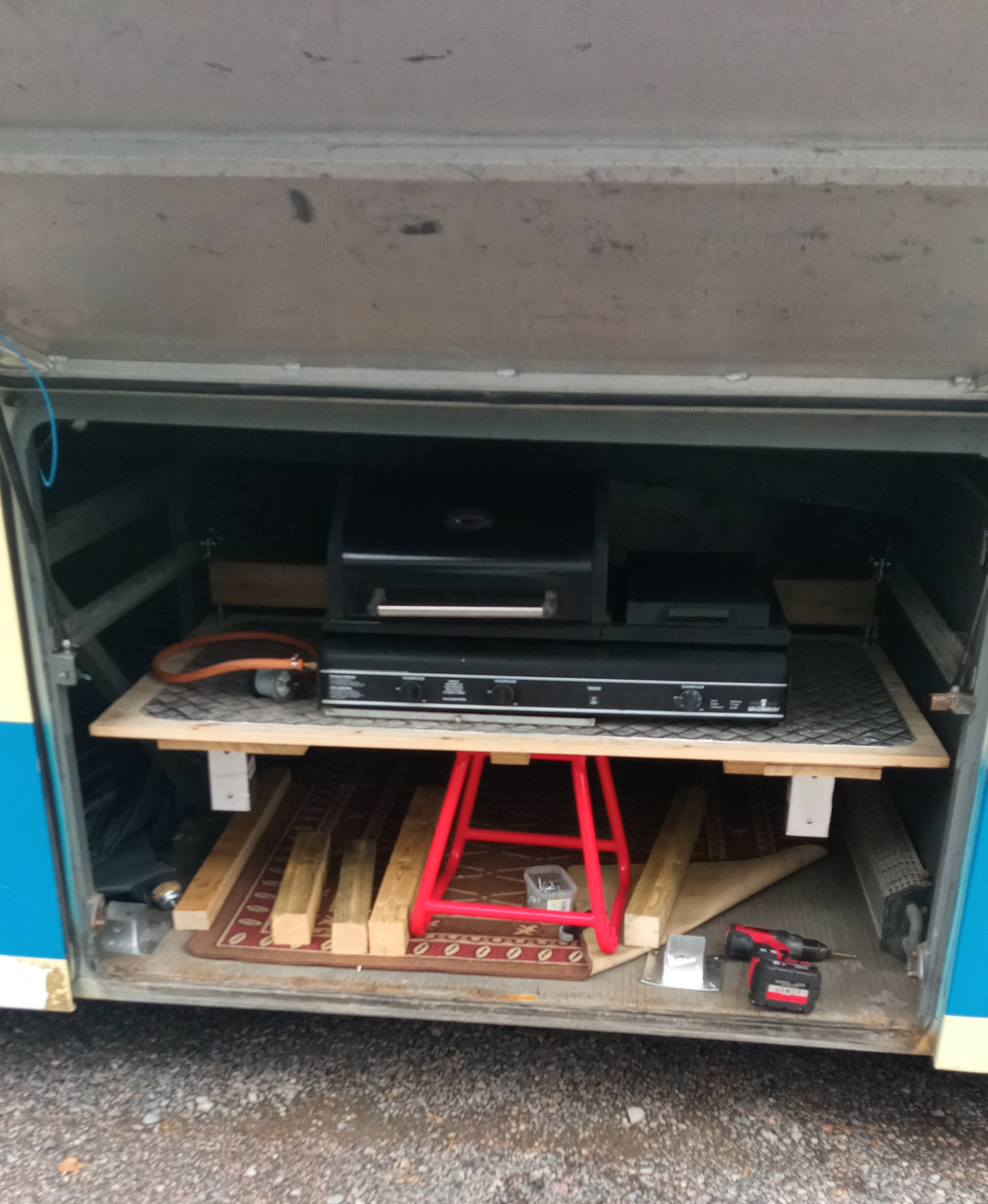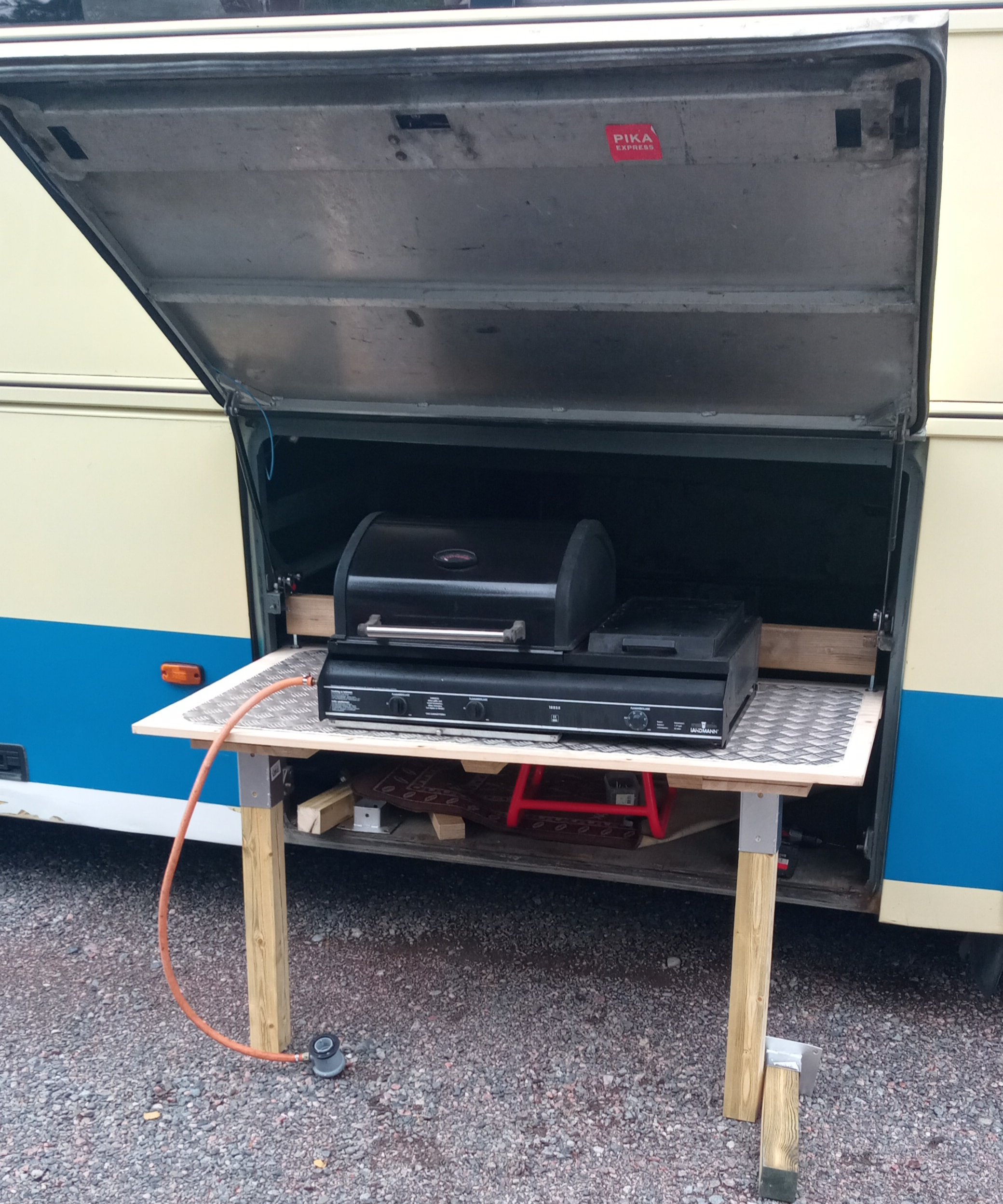 Tosiaa tuli ruuman puolelle tehtyä ulos vedettävä pöytätaso johon saa kaasugrillin pultattua kiinni. Saa ruokahommelit tehä ulkona. Loppuviikosta saan grillin haettua ni laitampa sit valmiista paketista kuvaa