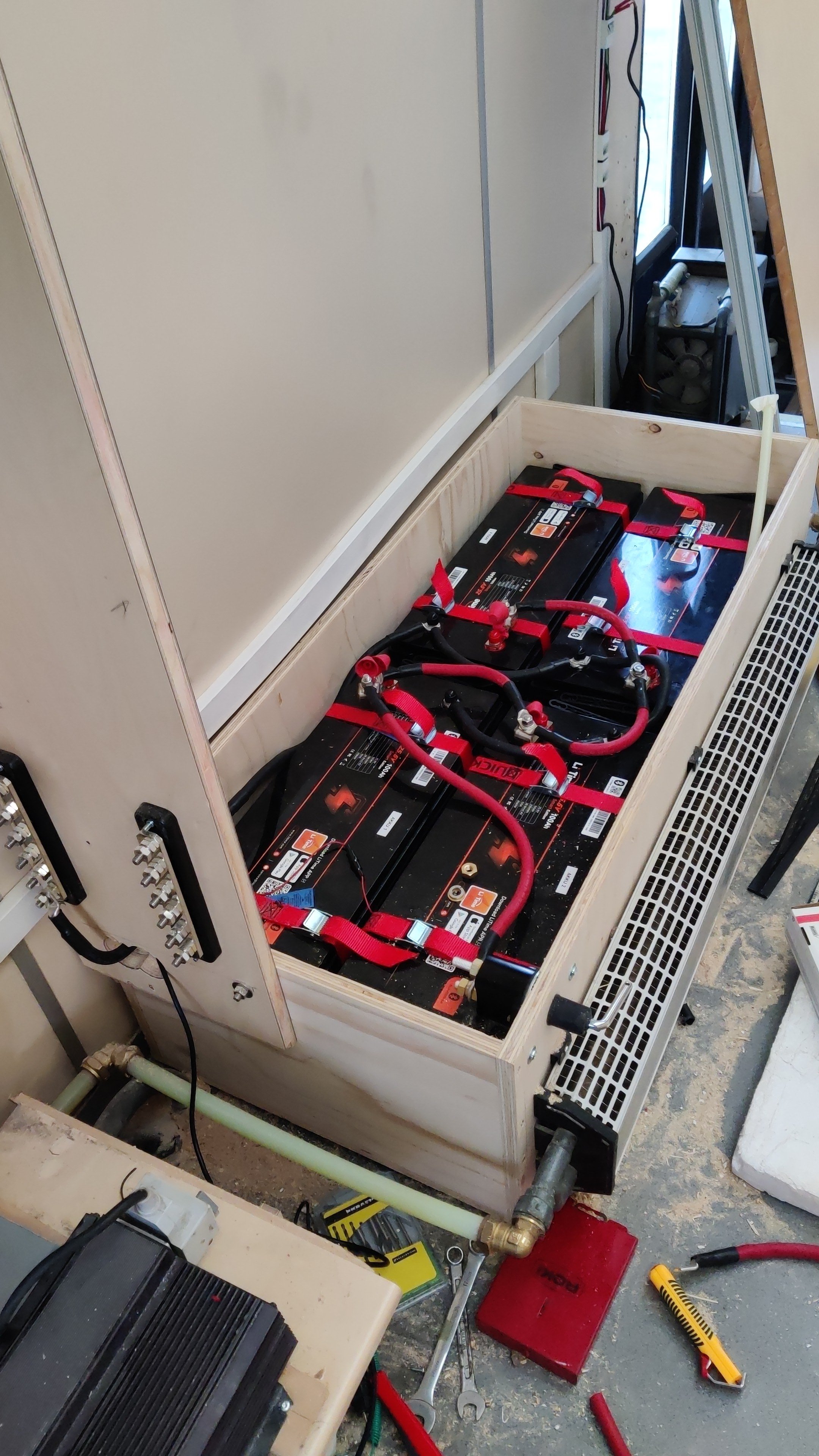 Varmaan olette huomanneet, että kupari on kallista. Niinpä akut siirtyvät ihan muiden sähköjen viereen sisätiloihin sohvan alle, ettei tarvitse vetää kymmeniä metrejä 100 neliön piuhaa, kun pääsee parilla metrillä ja puolta ohuemmalla.