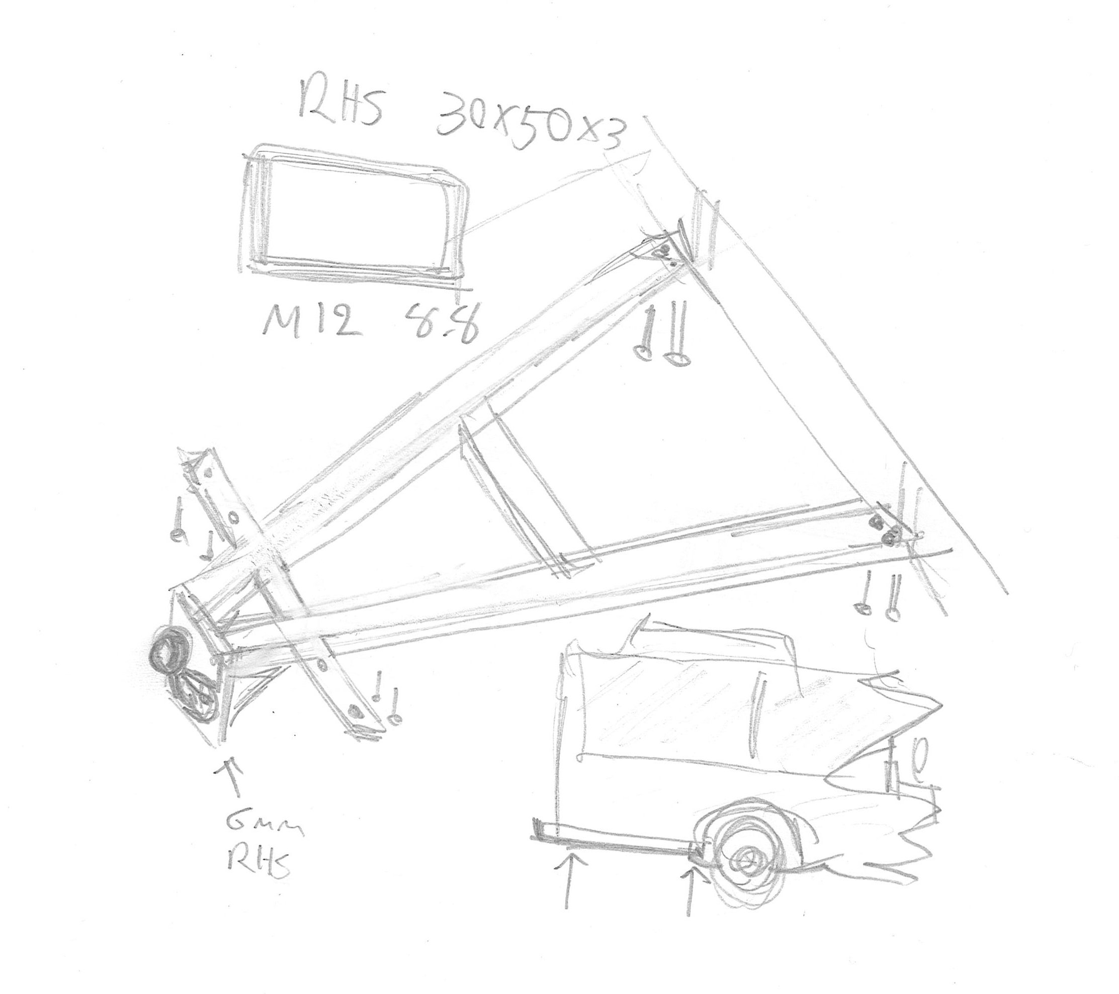 Mitään rakettitiedettähän tuo ei ole. Palkkia ja sähköliimaa sekä muutama pultti/mutteri. Takaakselin takana on tukeva koritehtaan palkki, josta saa läpipultit helposti asennettua. Kaavailen sellaista A-kirjaimen muotoista tukirankaa. Sakarat tulisivat jousikorvakkeiden tienoolle ja kärki takapuskurin tukirakenteisiin. Koukkujahan saa kaupasta.