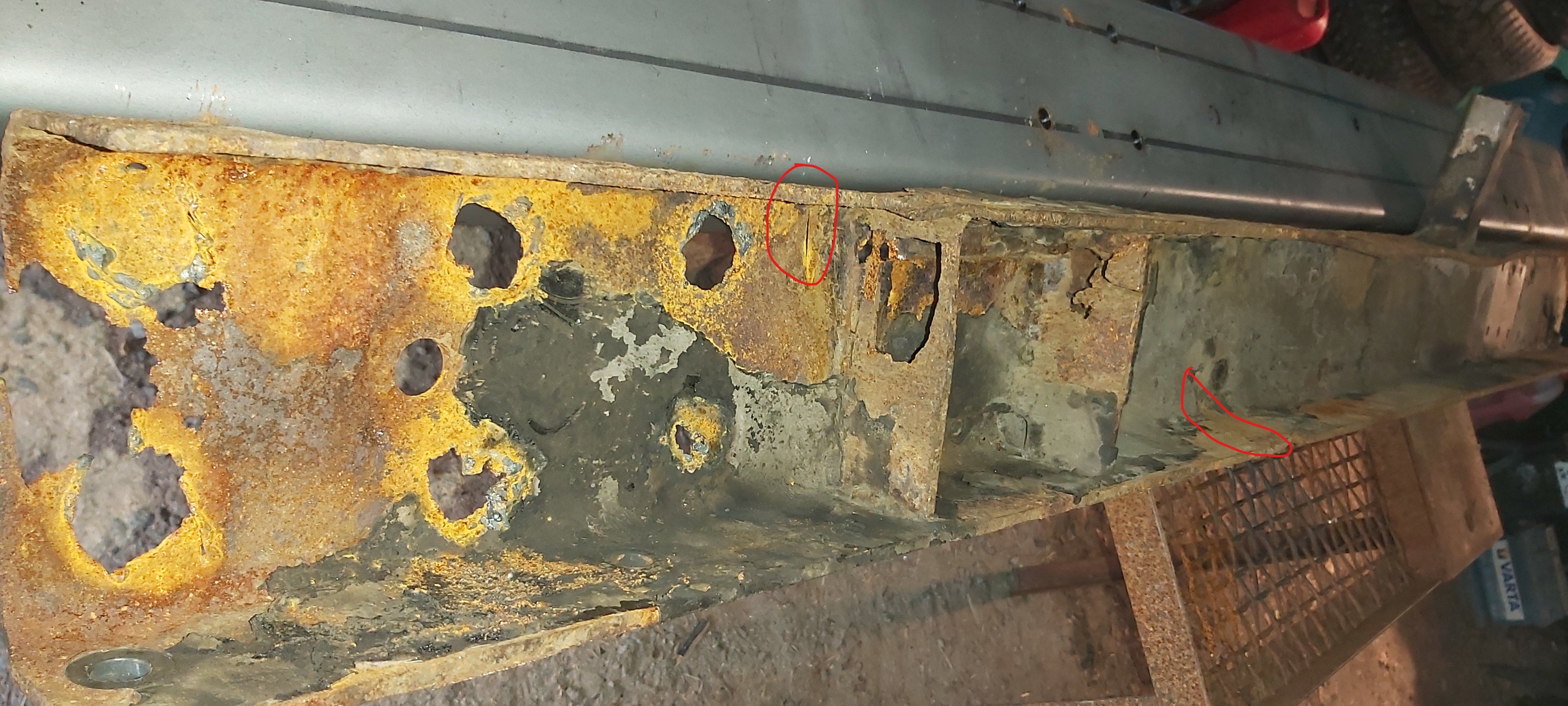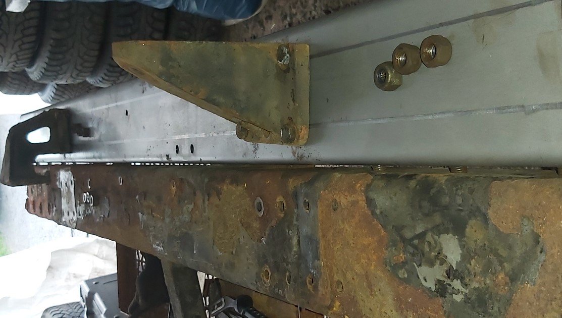 Uudet palkit tuli ja työ jatkuu. Vasen palkki jo purettu. Rasvanpoisto ja ferreksi ja esabliima. Ei tarvinut suurentaa reikiä, oli ilmeisesti mittanauha kalibroitu. Tekivät pajalla hyvää työtä ja takasivupalkki sopii justiinsa.