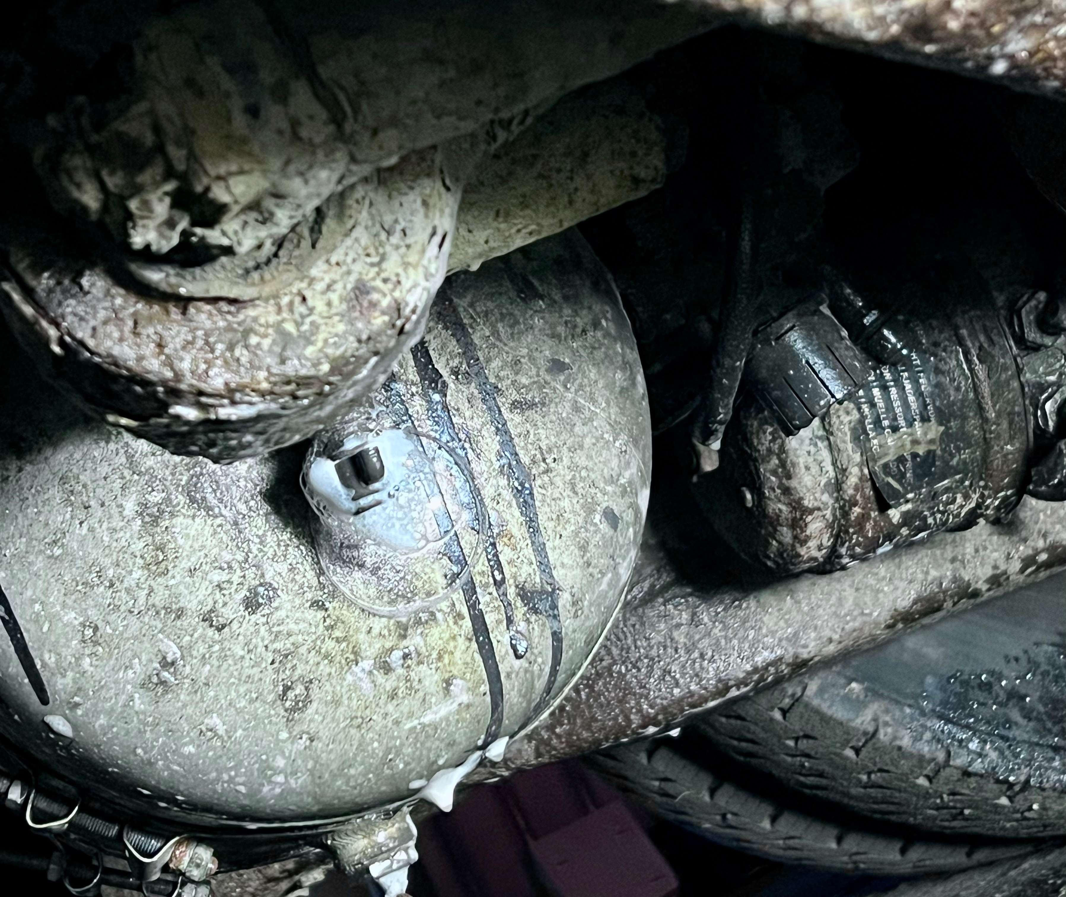 Kyllähän se vasen takapussi onkin mikä vuotaa. Huoltoluukku ruumatilassa niin sai näkyville. Ylälautasen ja siitä pussin yläreunan välistä puhaltaa. Mikäs tuo tankohässäkkä?