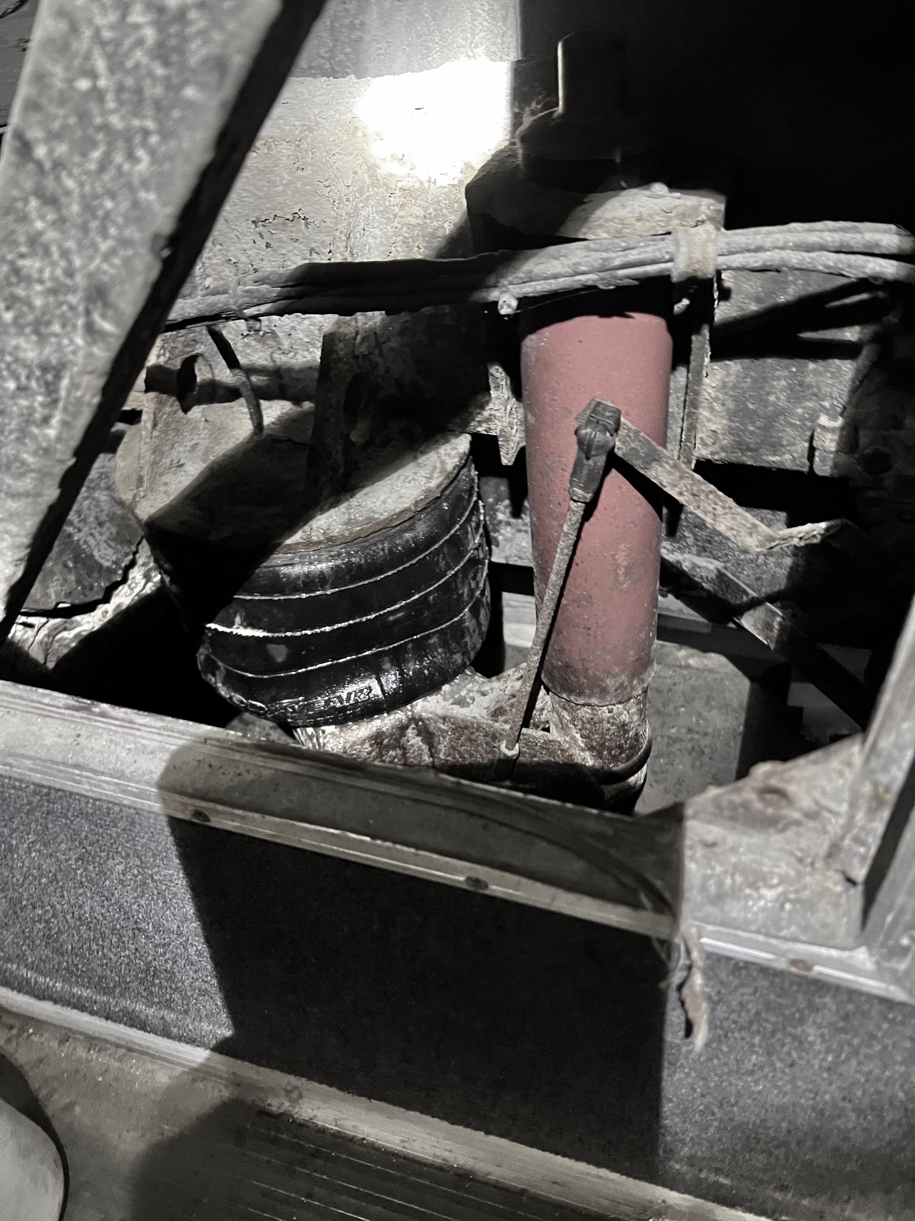 Käyty vähän taas tutkimassa. Vasen jousipussi vaikuttaa ehjältä mutta painetta sinne ei jostain syystä tule. Paineilmasäiliö mikä takapyörien välissä niin siinä joku nippa tai varoventtiili mikä lie niin päästää vähän läpi kun suihkuttelin saippuavettä.ei nyt mitään paljon vuoda mut kuplaa tulee kun suihkuttelin.