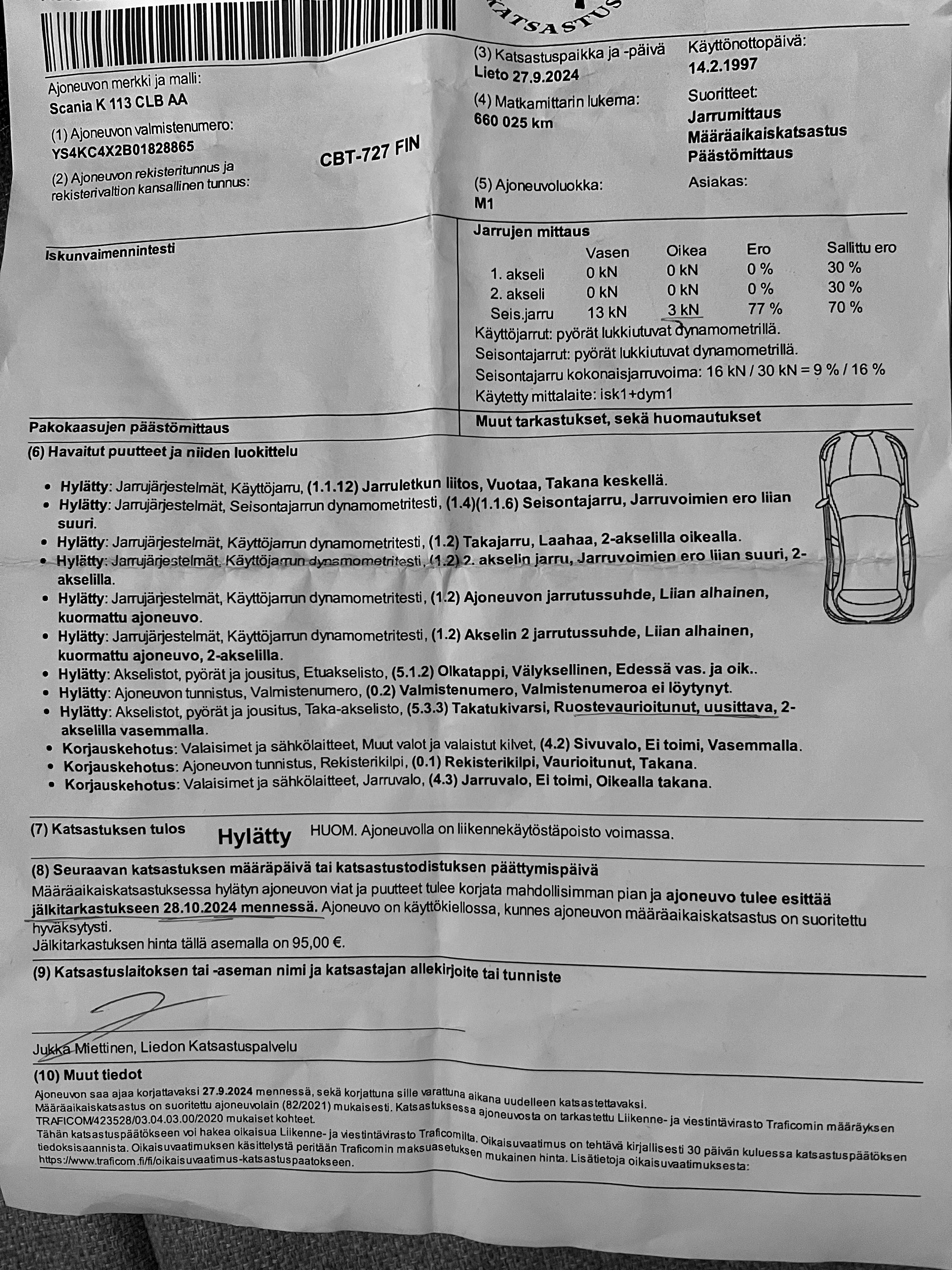 Jarruja ei ikinä kannata ajaa konttorilla. Käyt jossain korjaamolla niin ne herkistelee ja säätelee ja antaa konttorille kelpaavan lapun samaan hintaan mitä pelkkä testaus konttorilla..