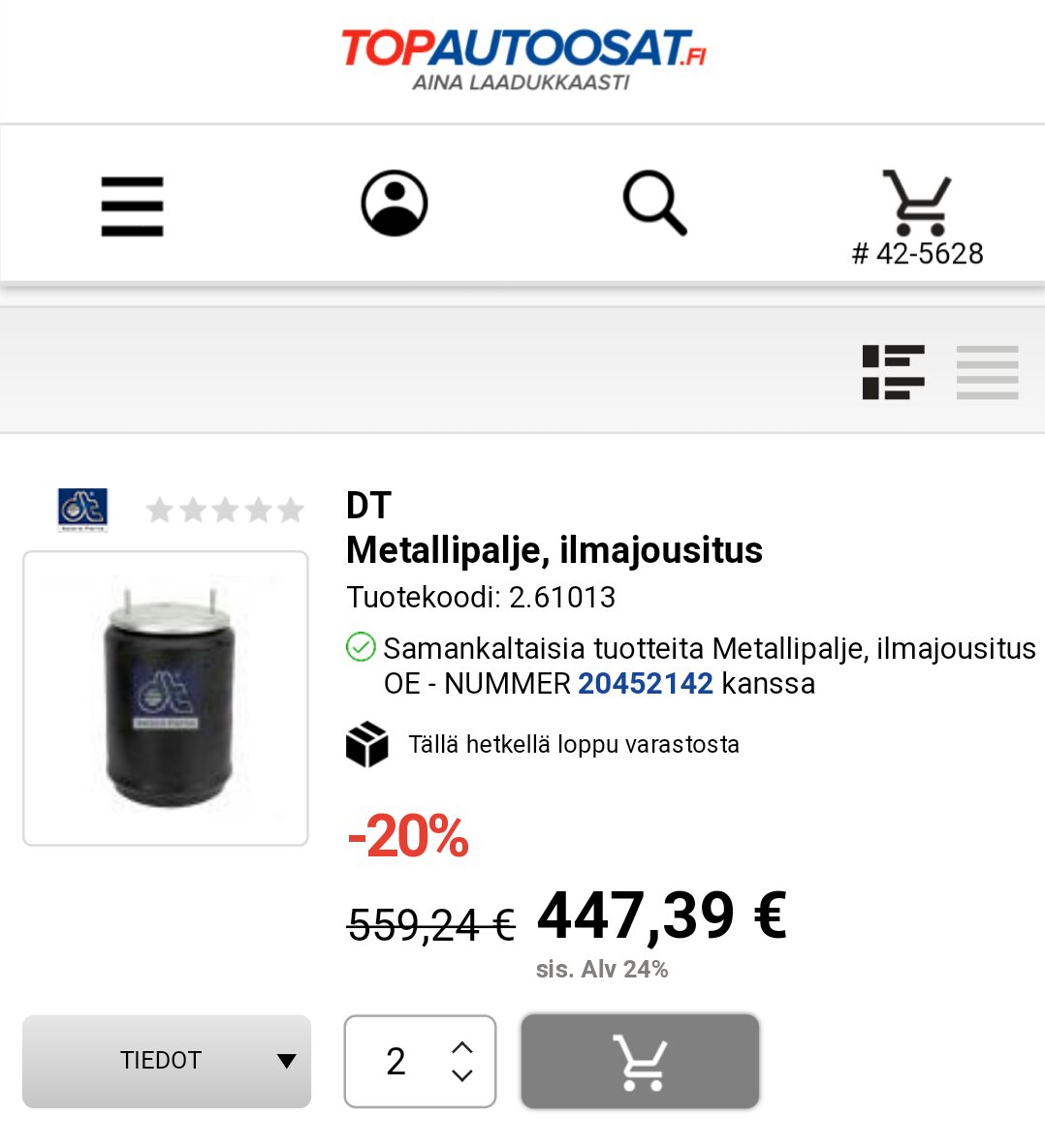 Volvon numerolla löytyy edullisesti vaikka tuolta, halpaa ku saippua: https://www.autonvaraosat24.fi/search?keyword=20452142 mutta sitten on nuita referenssinumeroita, vastaavia, ainoa ero on joku milli halkasijassa ja jokunen maljan korkeudessa mitä olen vertaillut. Ei kai se ole ku tippuu sit vaan alemmas matalammalla maljalla? https://www.autonvaraosat24.fi/oen/20479800 680e jää parille hintaeroa, joten ehkä sallin stansemman makuuasennon =D