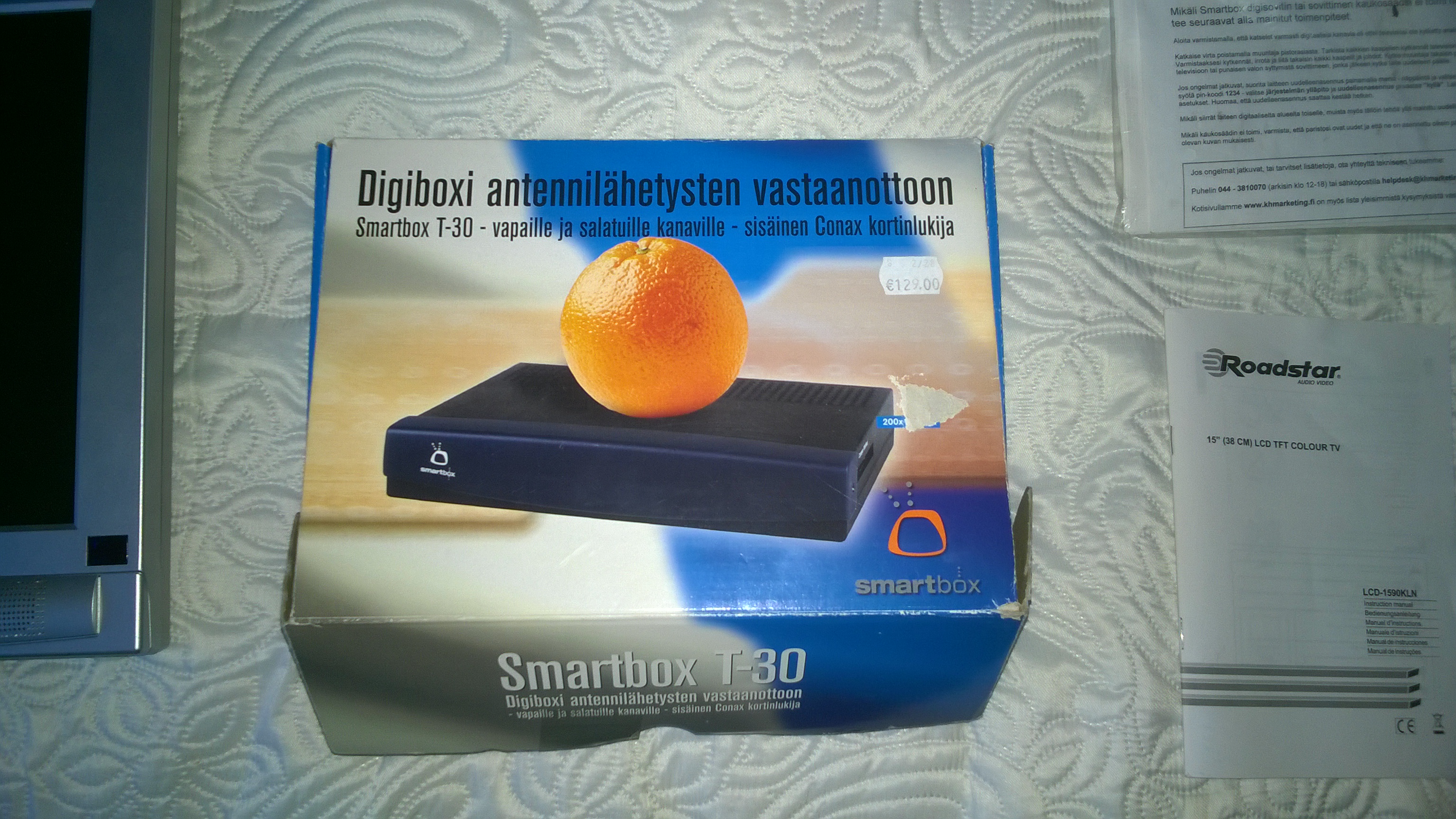 ohjekirjat, kaukosäätimet, johdot ym. mukana. 12v ja verkkovirta. Digiboxin päällä hintalappu, 125€ Myydään kun suunnitelmat muuttuivat. Käytin päällä ja ainakin ylen kanavat löytyivät. TV:lle ei ole mitään kiinnikkeitä, mutta monet kiinnityspisteet löytyvät takaa.